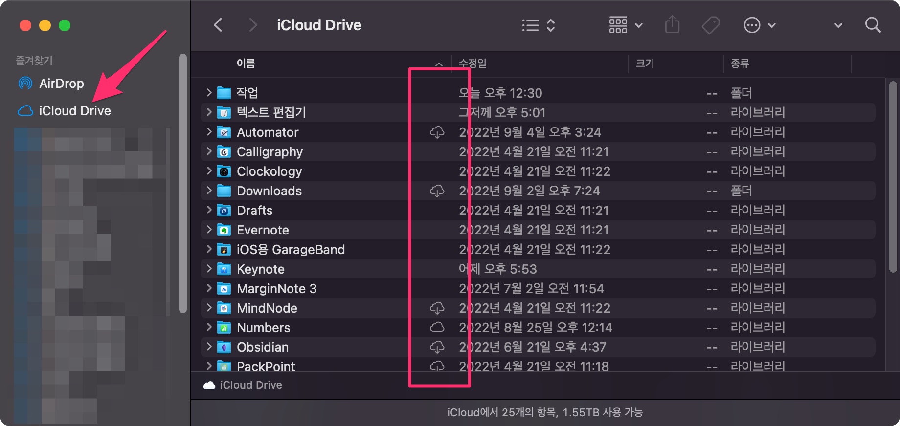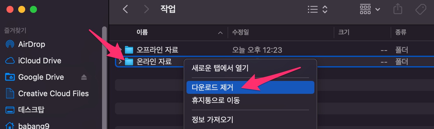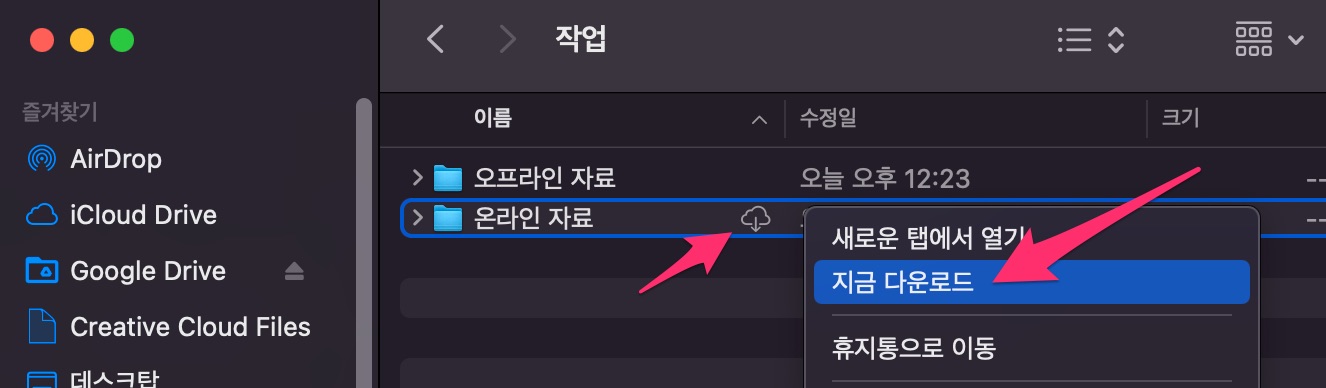 그러면 해당 폴더(또는 파일) 옆에 구름 화살표 아이콘이 보입니다.