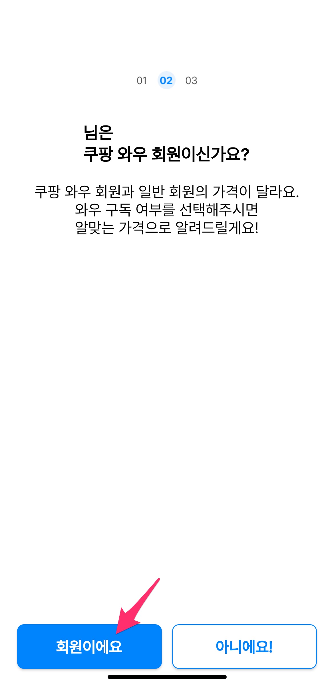 아까 말씀드렸던 쿠팡 와우 회원이시면 회원이에요 버튼을 선택하시면 됩니다.