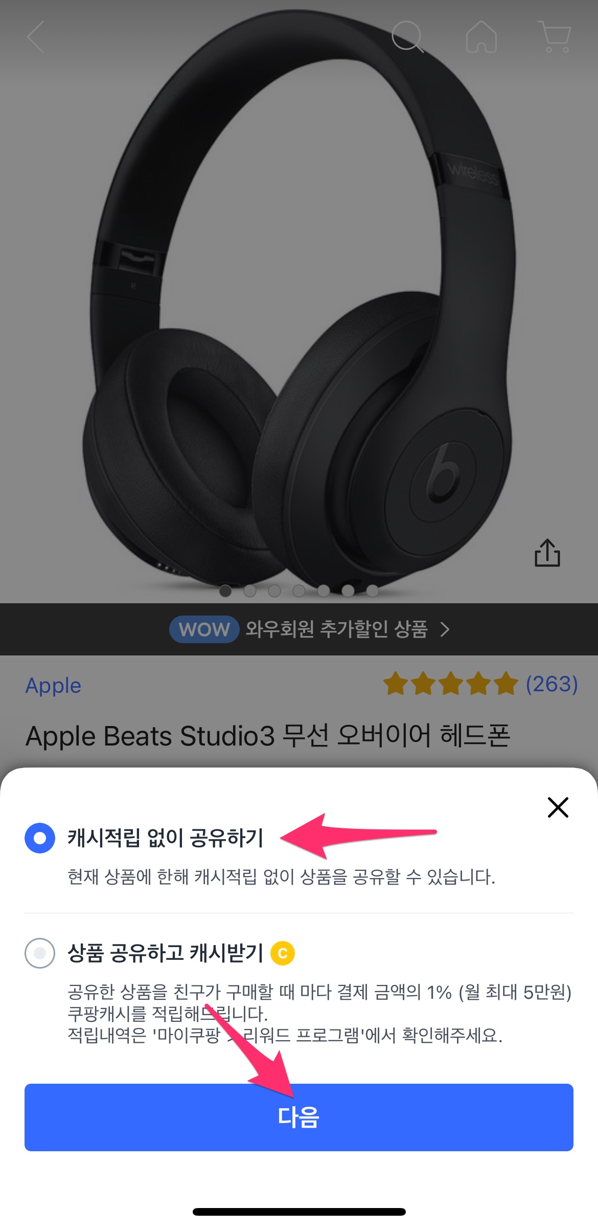 캐시적립 없이 공유하기를 선택하고 다음을 선택합니다.