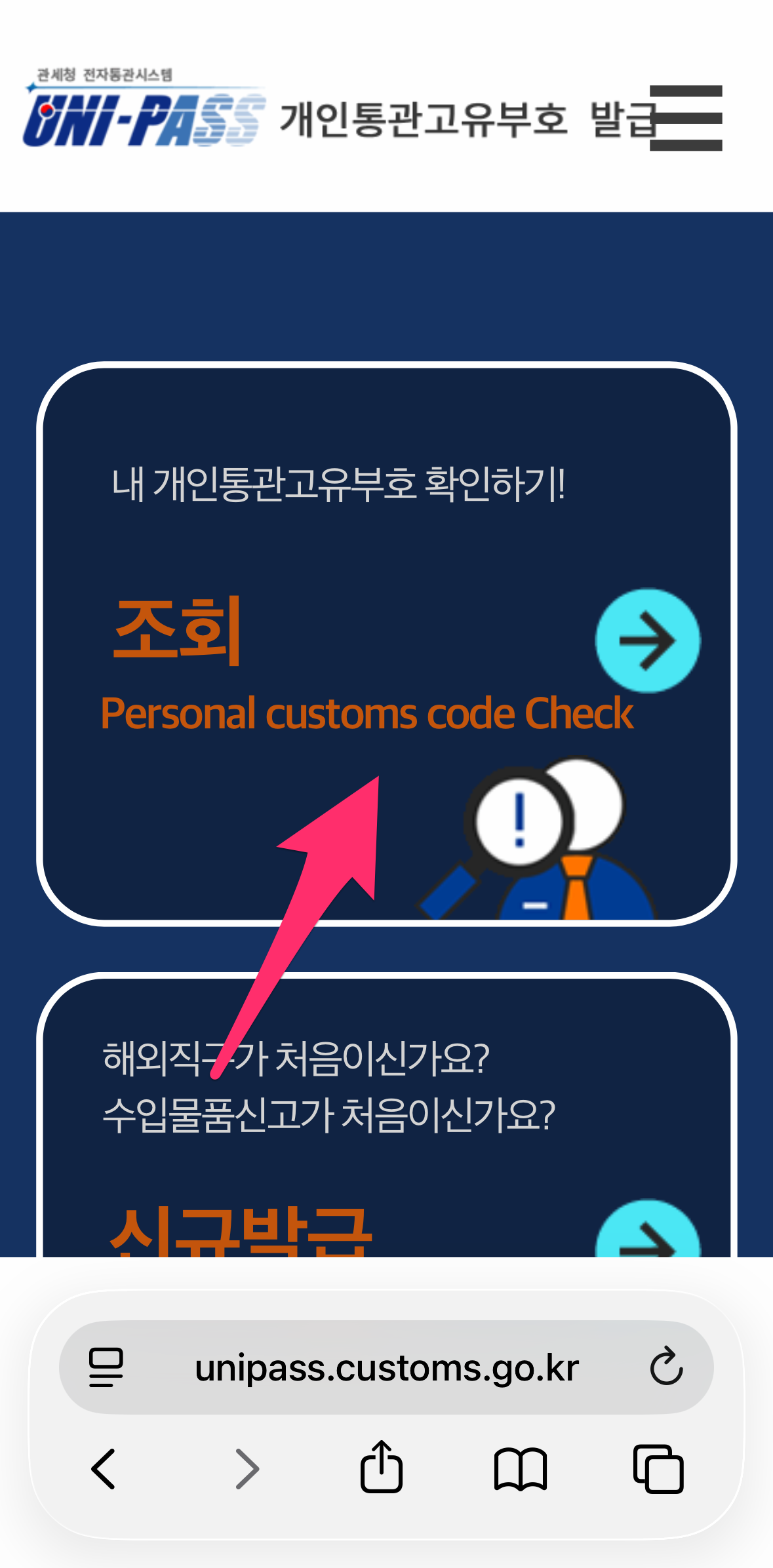 스마트폰에서 관세청 유니패스 공식사이트(https://unipass.customs.go.kr) 접속합니다.