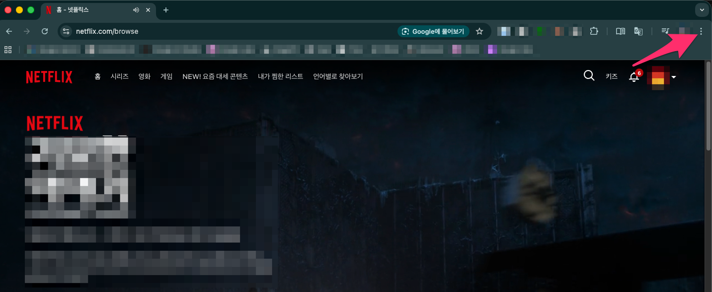 넷플릭스를 접속한 상태에서 크롬 브라우저 오른쪽 상단에 [Chrome 맞춤설정 및 제어]를 선택합니다.