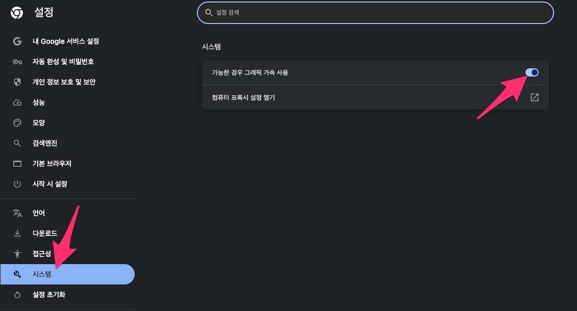 메뉴 중에서 [시스템]을 선택한 후에 [가능한 경우 그래픽 가속 사용] 체크를 해제합니다.