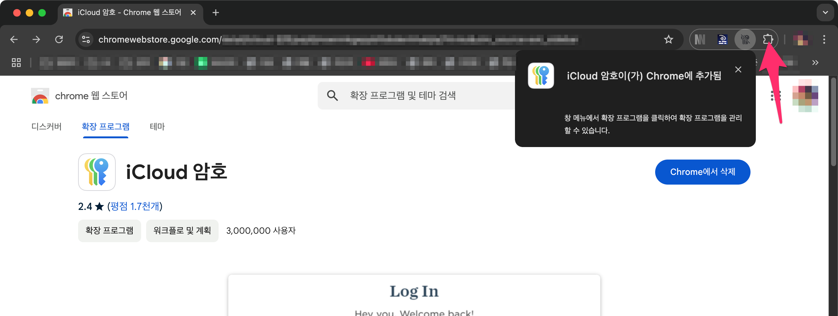 iCloud 암호가 추가됨 메시지가 뜨면 상단에 확장 프로그램 아이콘을 클릭합니다.
