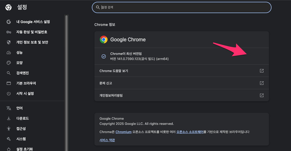 재시작 후 다시 'Chrome 정보'를 확인하여 최신 버전으로 업데이트되었는지 확인하는 것이 좋습니다.