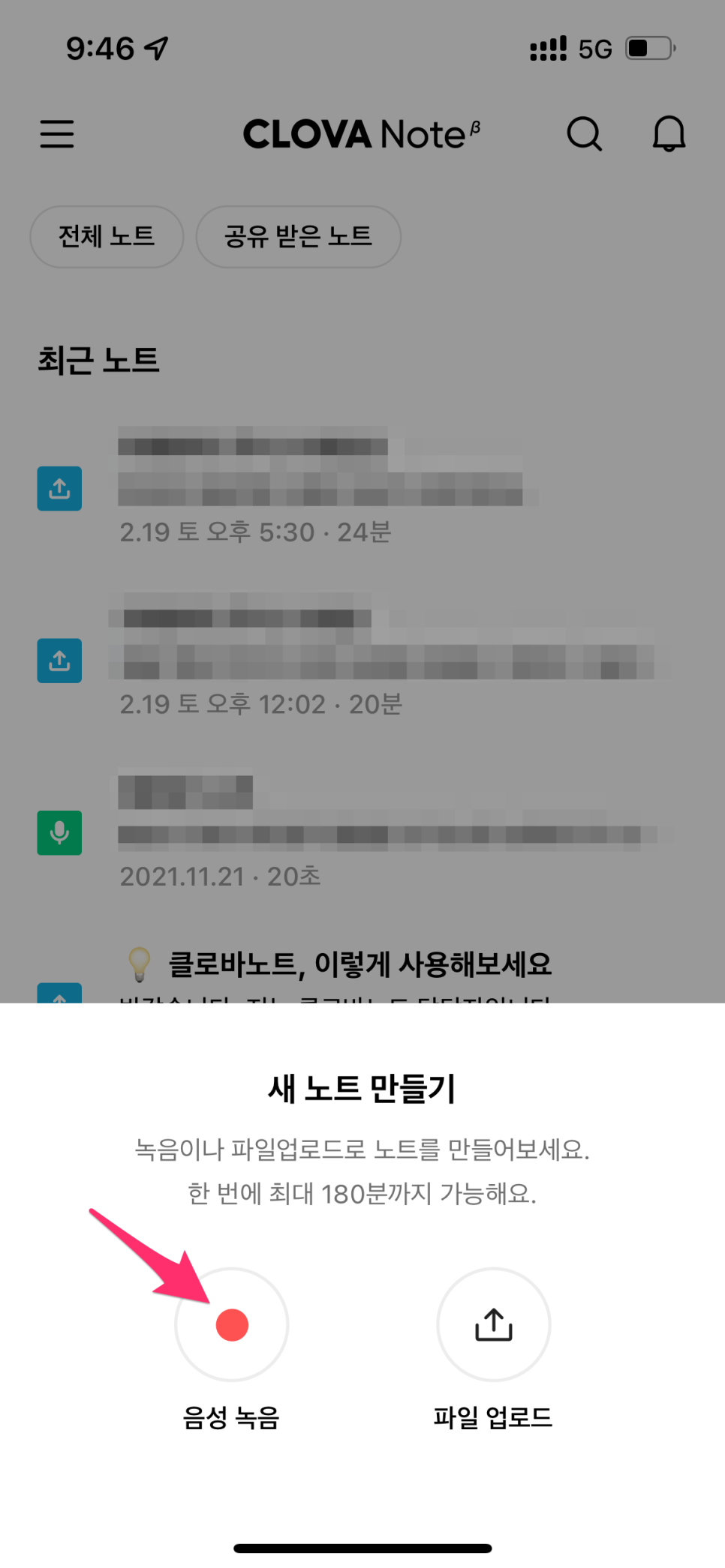 음성 녹음을 선택하면 실시간 녹음이 진행되고 파일 업로드를 선택하면 음성파일(m4a, mp3, aac, amr, wav)을 업로드하면 됩니다.