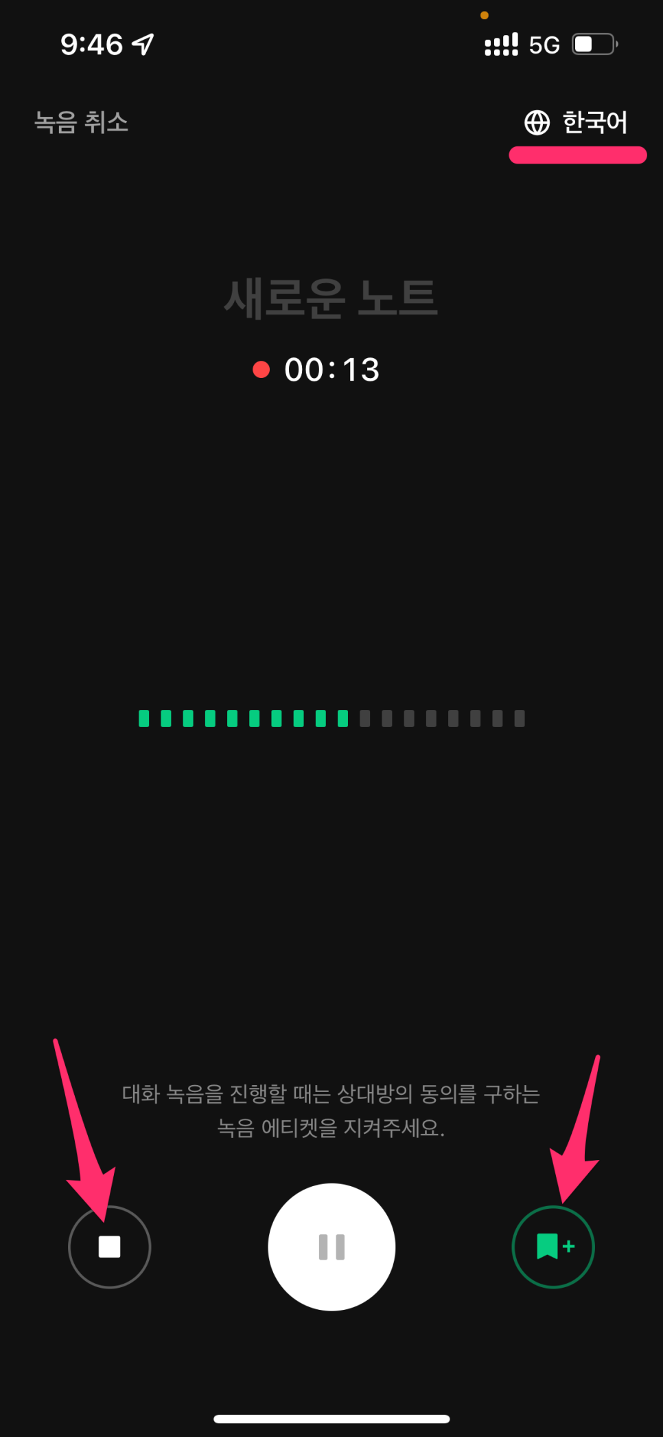 녹음이 끝나면 왼쪽 하단에 중지 버튼을 선택하면 됩니다.