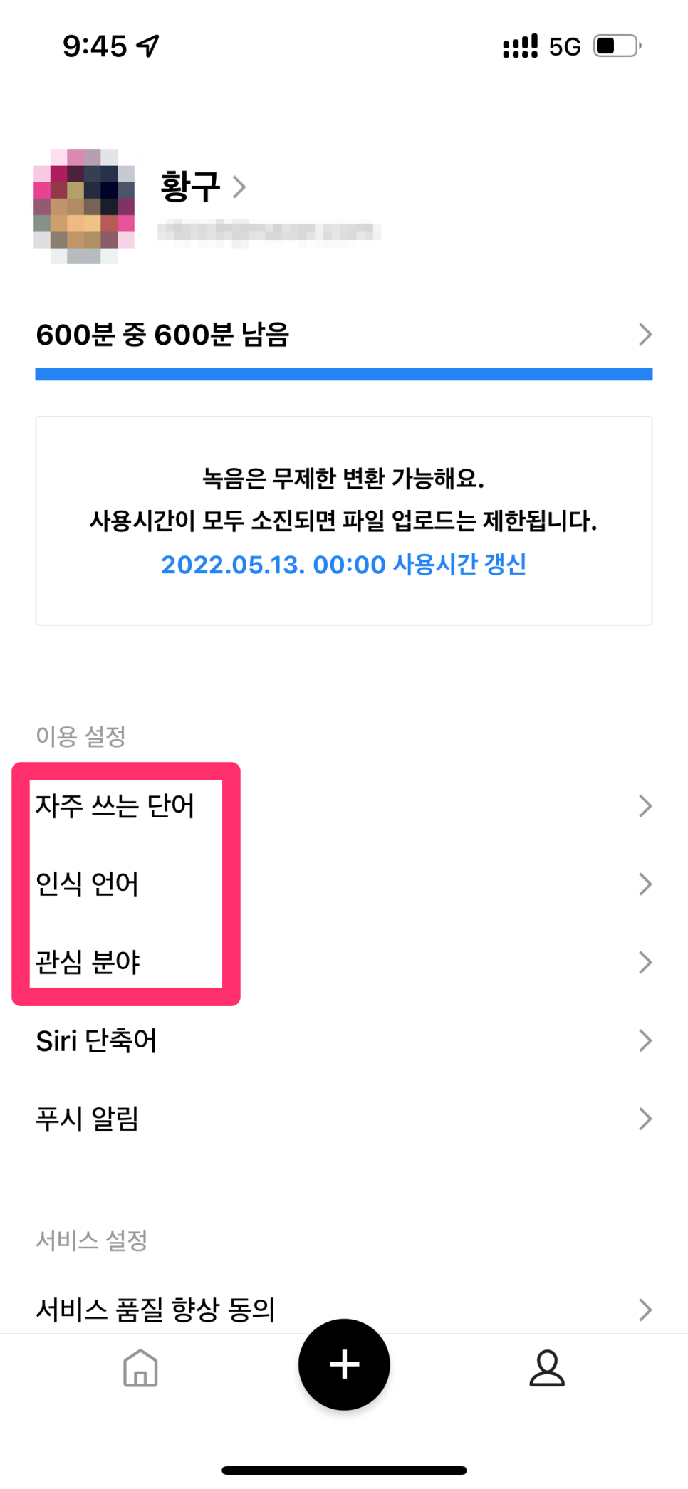 • 자주 쓰는 단어 : 전문 용어나 자주 사용하는 단어를 등록하면 인식률이 높아집니다. (한국어만 지원)