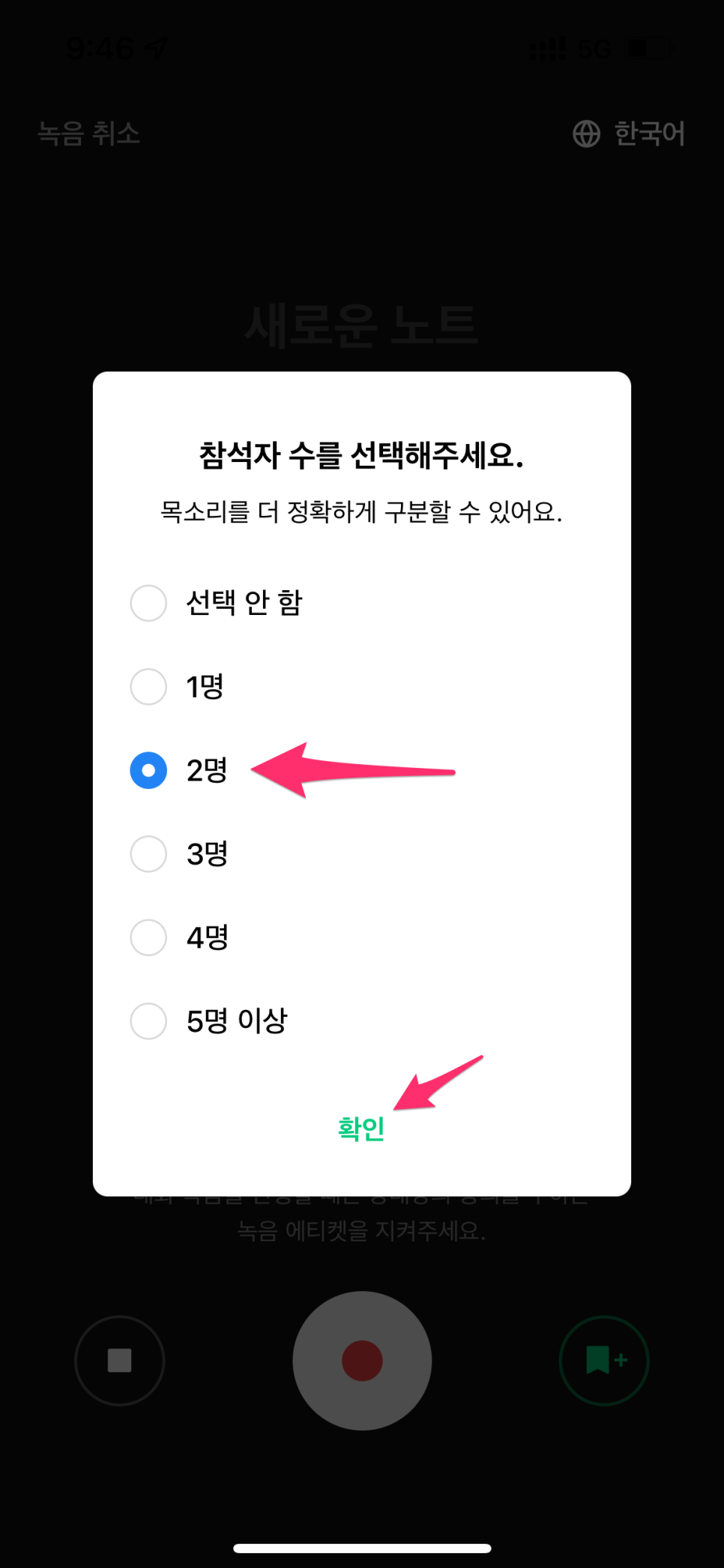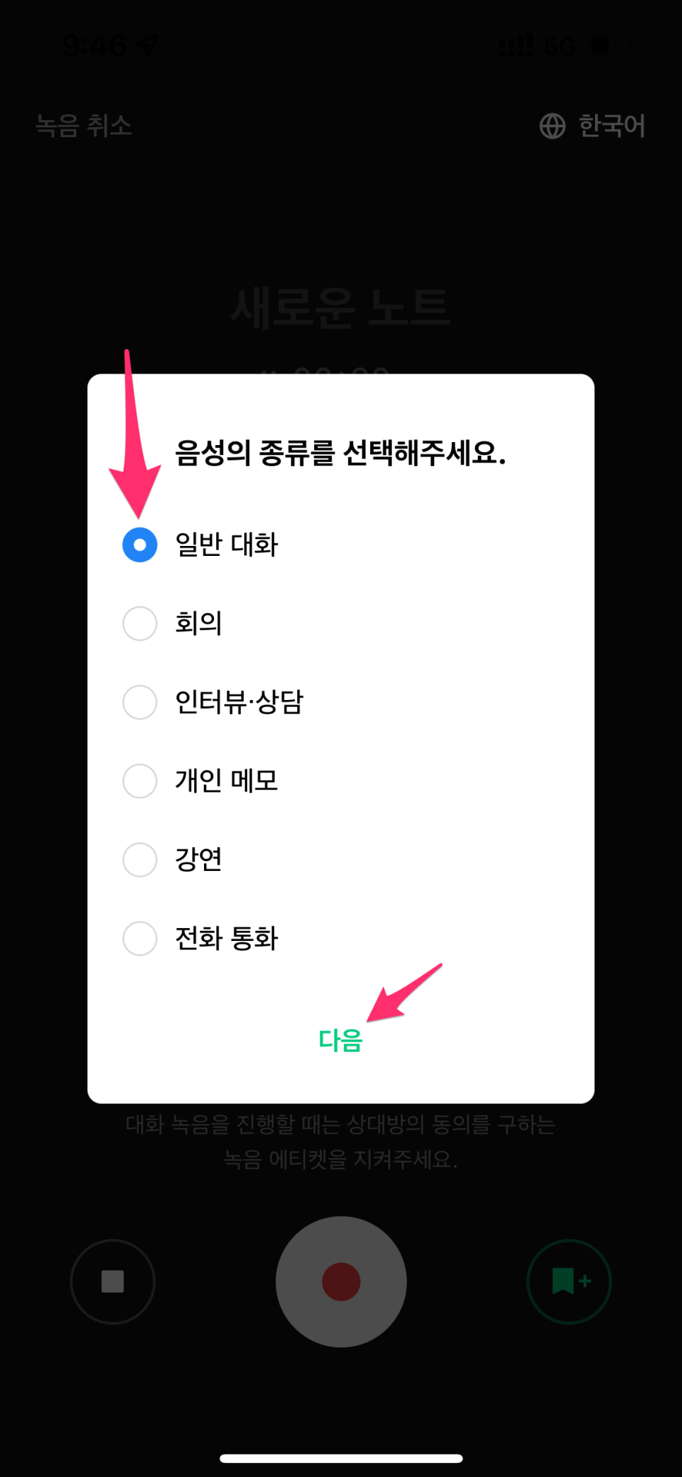 • 인식 언어 : 선택한 언어로 음성 기록이 변환(한국어, 영어, 일본어, 한국어+영어)