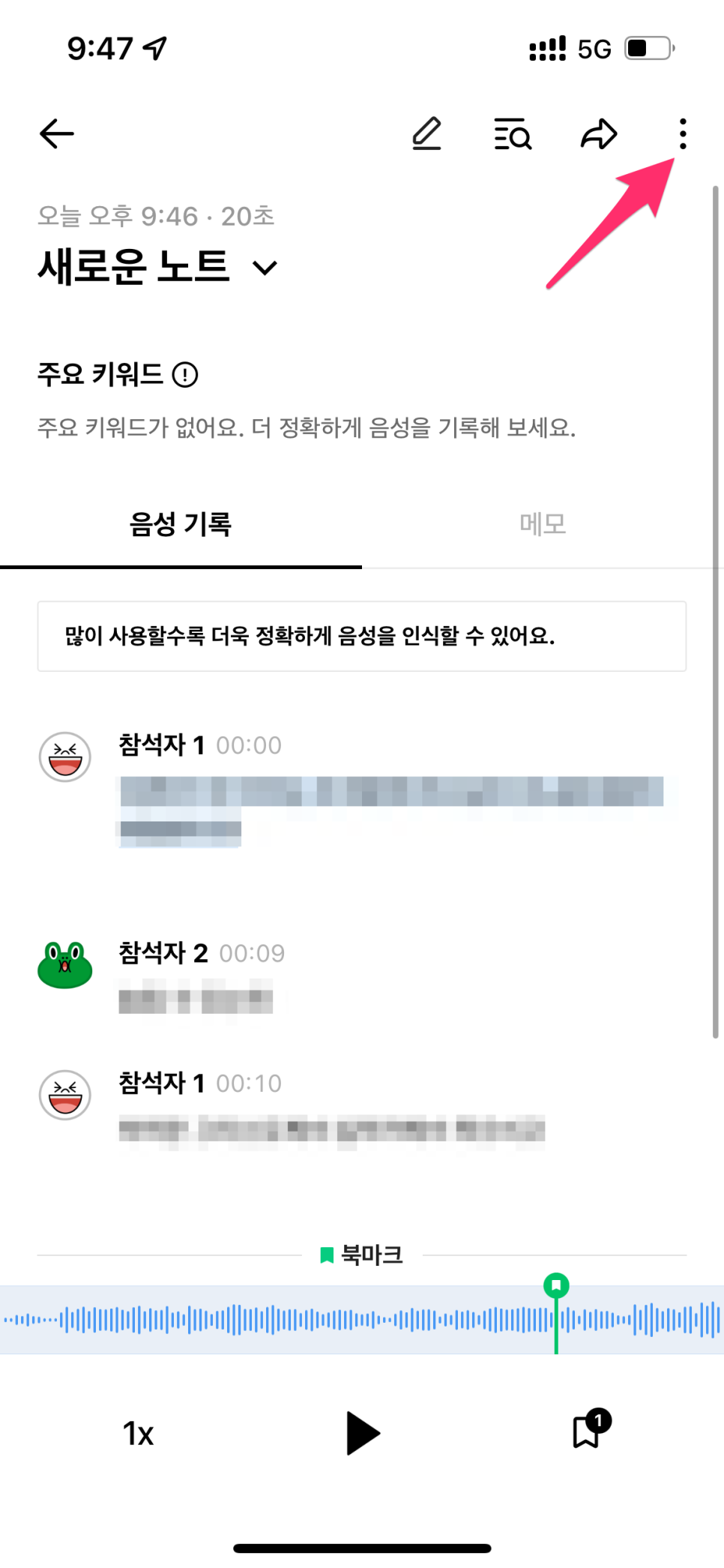 변환된 기록을 보시면 참석자 구분도 되고 북마크 부분도 확인하실 수 있습니다.