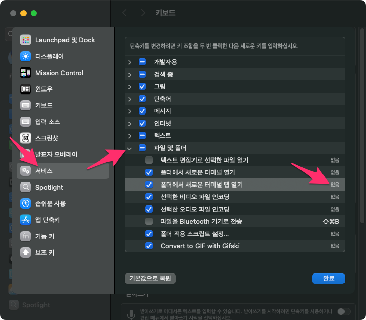 파일 및 폴더 → 폴더에서 새로운 터미널 탭 열기가 체크되어 있는지 확인합니다.