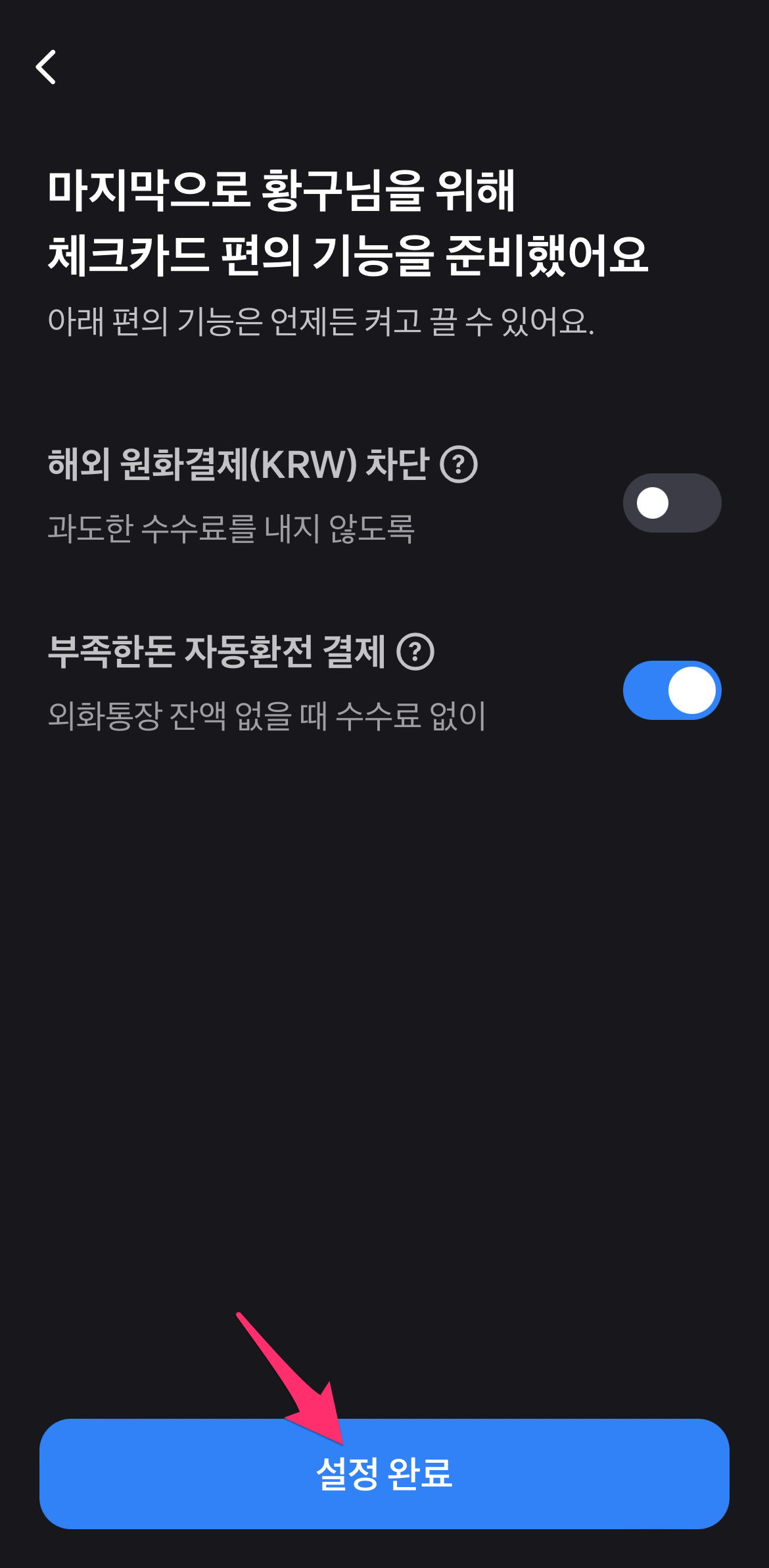 체크카드 편의 기능을 설정 완료하시면 모든 것이 끝납니다.