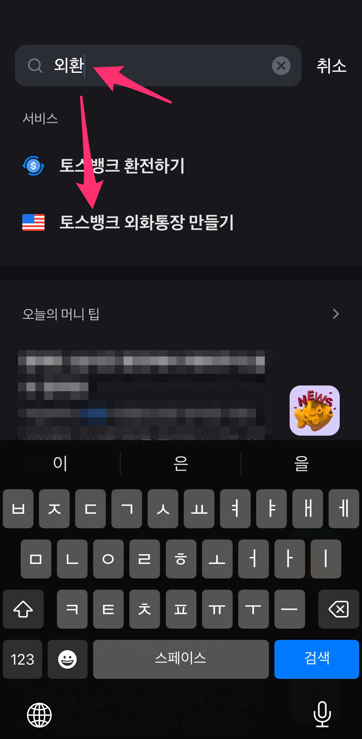 토스 앱에서 '외환'이나 '외화통장'이라고 검색하시면 토스뱅크 외화통장 만들기를 선택합니다.