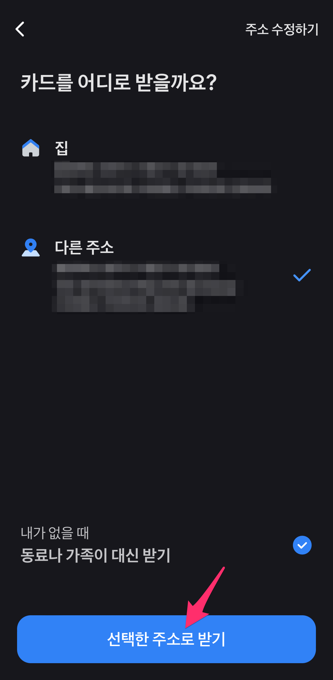 카드 수령지를 입력한 후에 선택한 주소로 받기를 선택합니다.