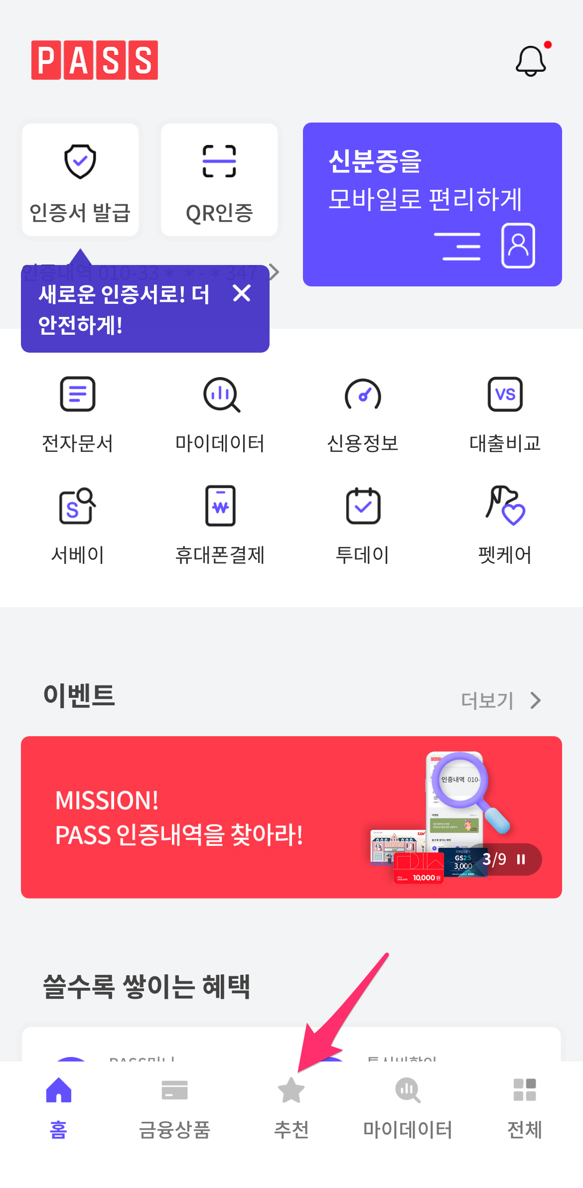 여러 가지 추천 메뉴 리스트에서 내 명의 휴대폰번호 통합 조회하기 를 찾습니다.