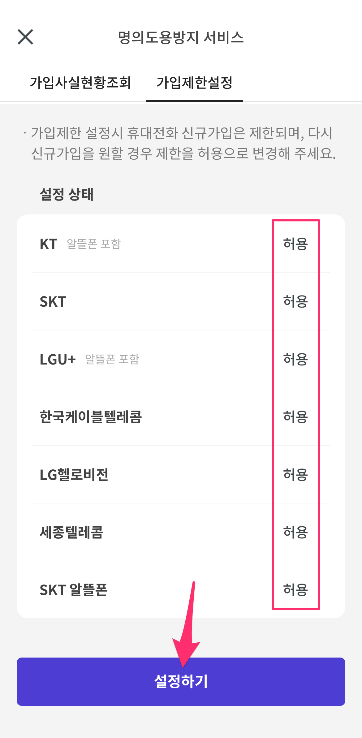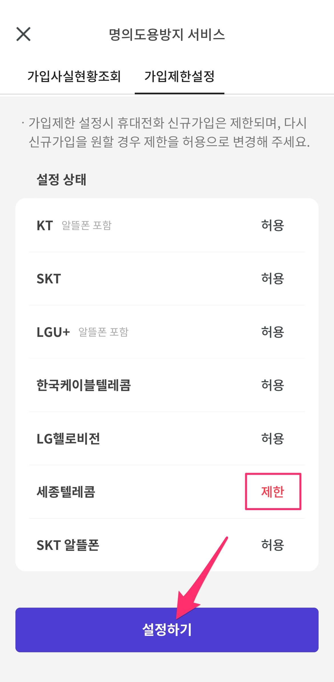 상단에 가입제한설정 텝을 선택하고 하단 가입제한설정 버튼을 선택하면 각 통신사의 설정 상태가 보입니다.