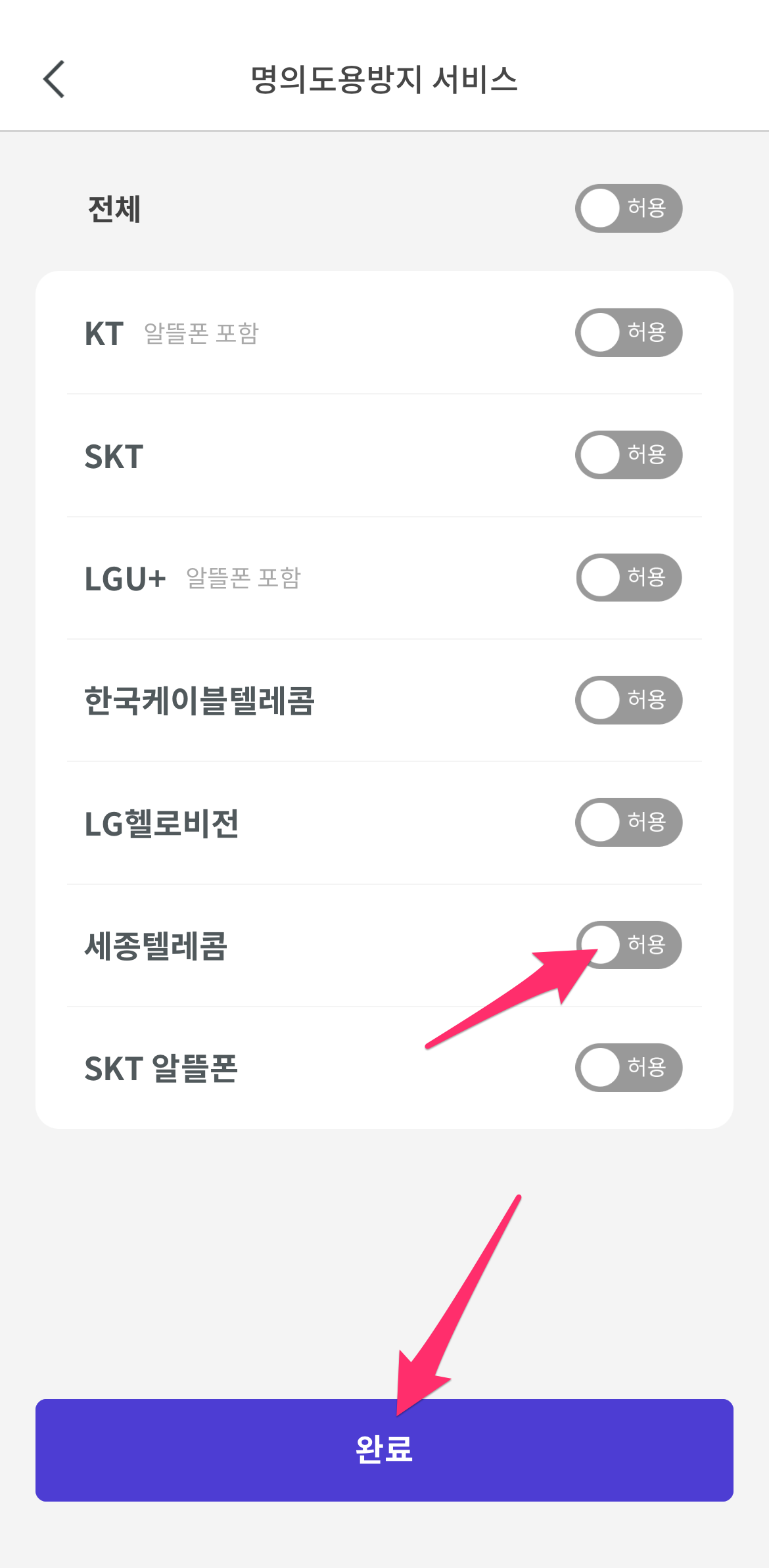 이제 개통 제한을 두고 싶은 통신사를 체크하여 제한을 둔 후에 완료 버튼을 선택하면 됩니다.