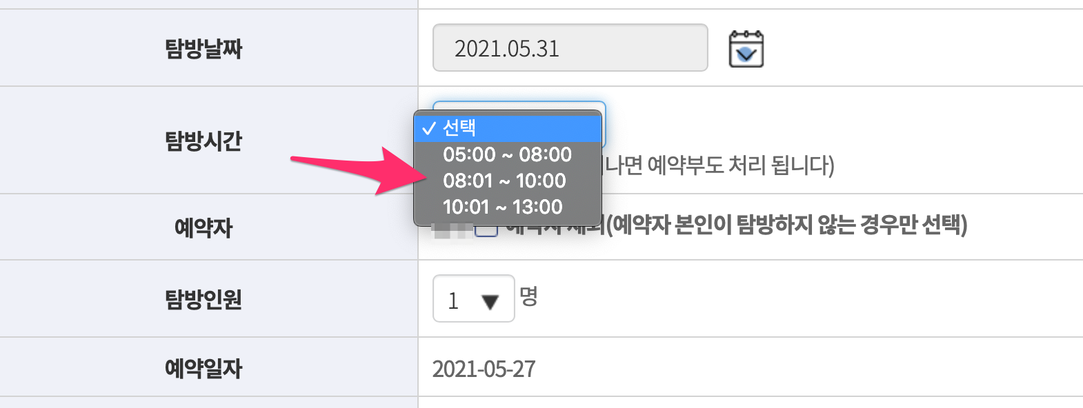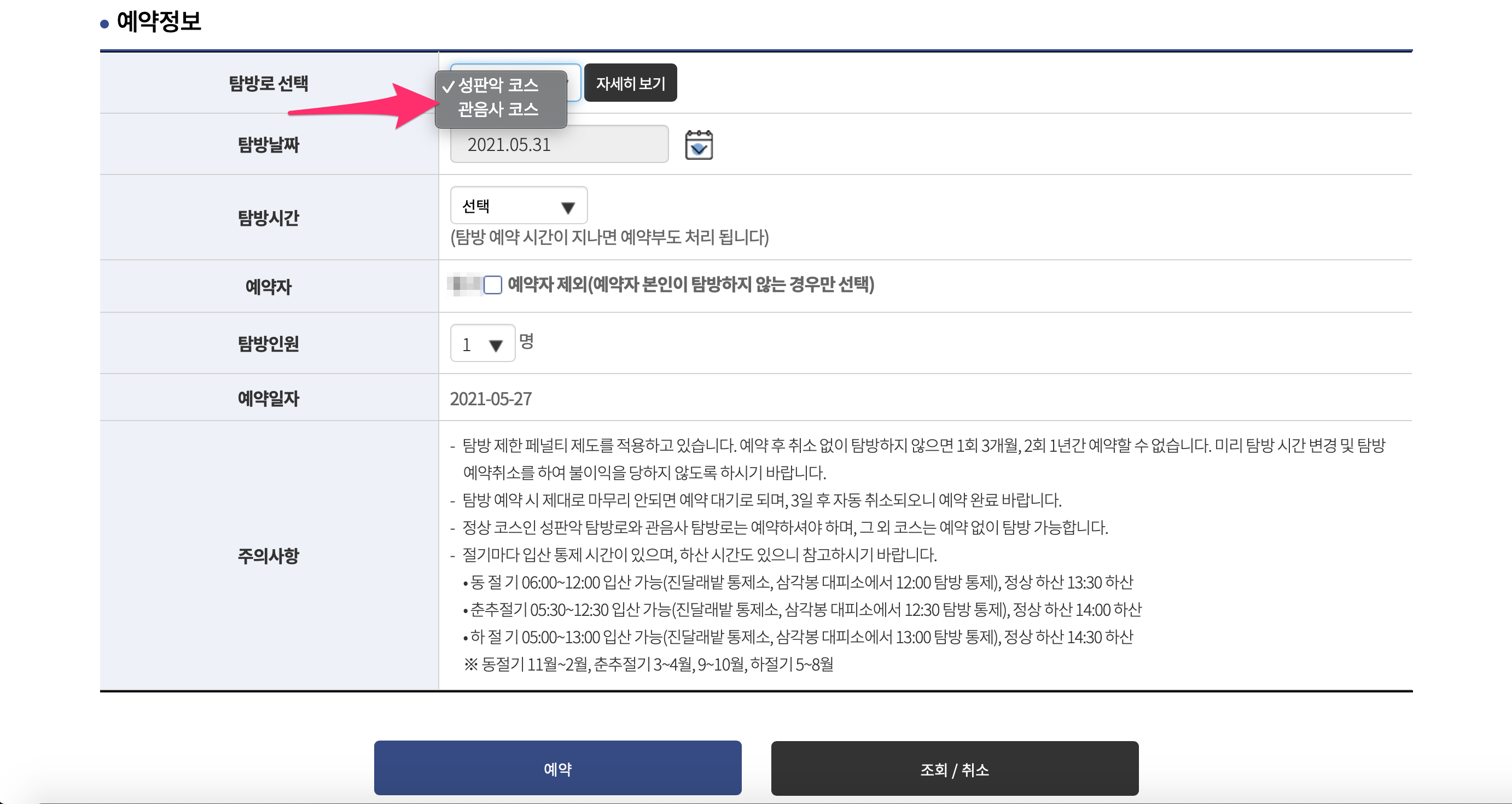 예약자에는 본인 이름이 있고 혹시나 예약자 본인이 탐방하지 않는 경우에는 예약자 제외를 체크합니다.