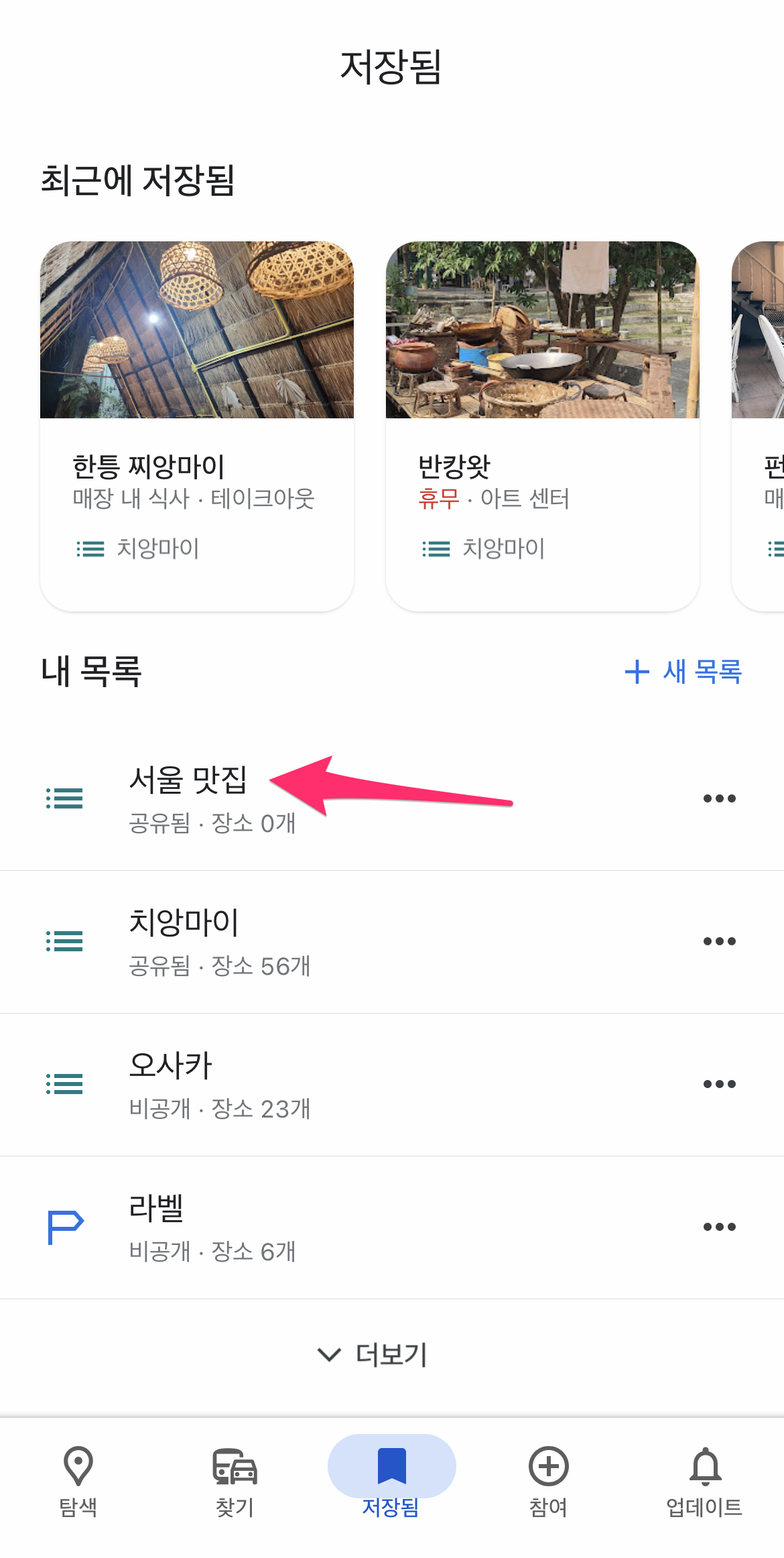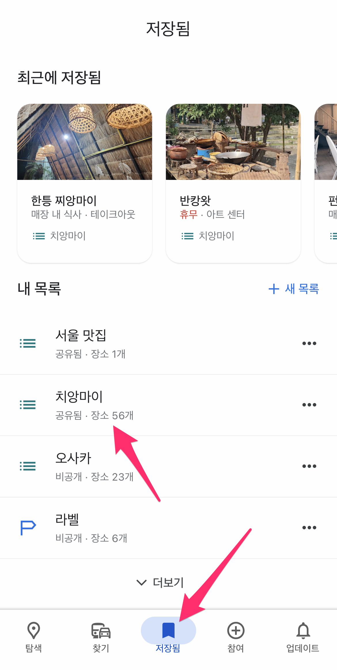 다시 하단에 저장됨 을 선택하고 미리 저장된 장소들이 있는 목록을 선택합니다.