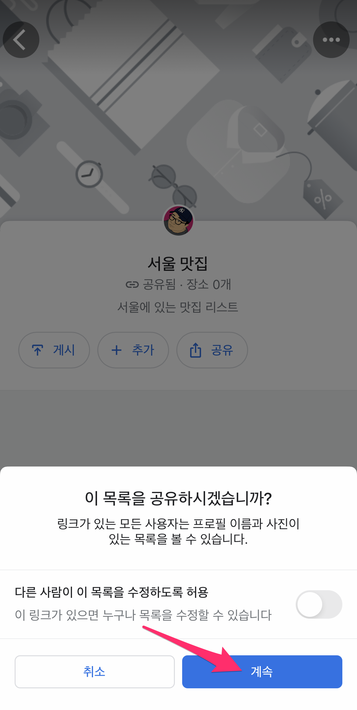 새로운 목록이 완성되면 하단에 계속을 선택하고 뒤로 가기 합니다.