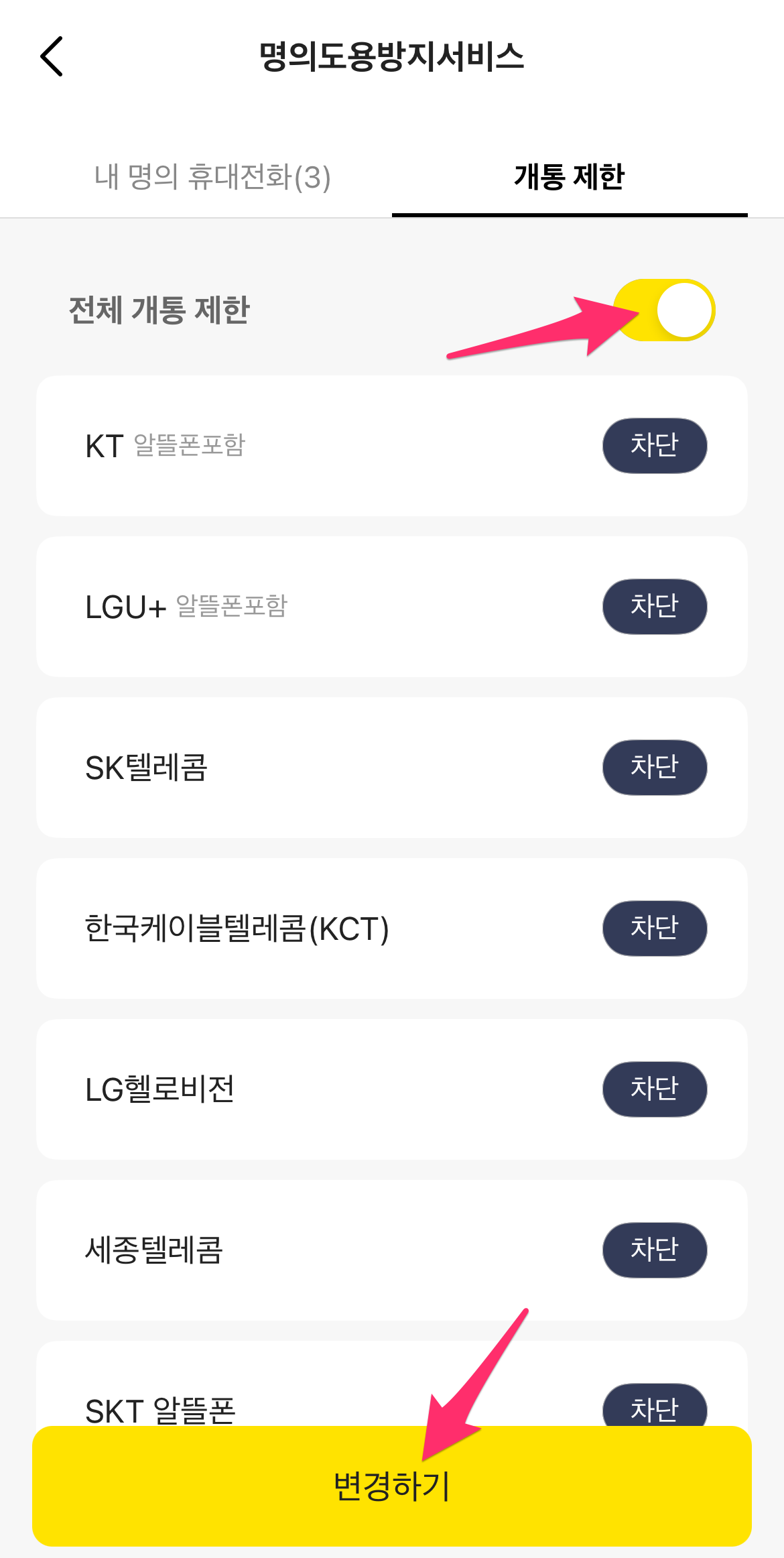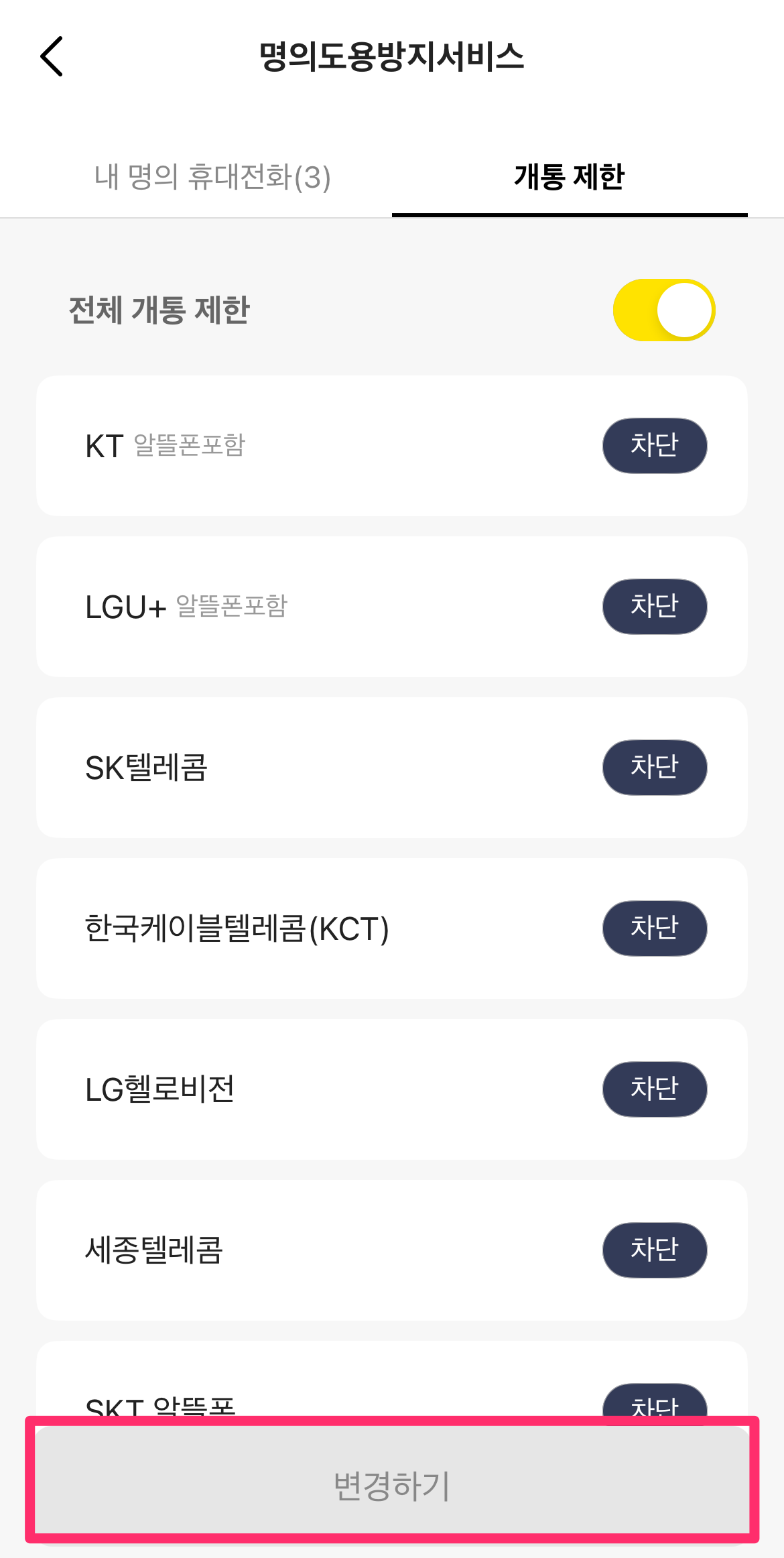 개통 제한 페이지에서 전체 개통 제한 체크버튼을 선택한 후에 변경하기를 선택하시면 됩니다.