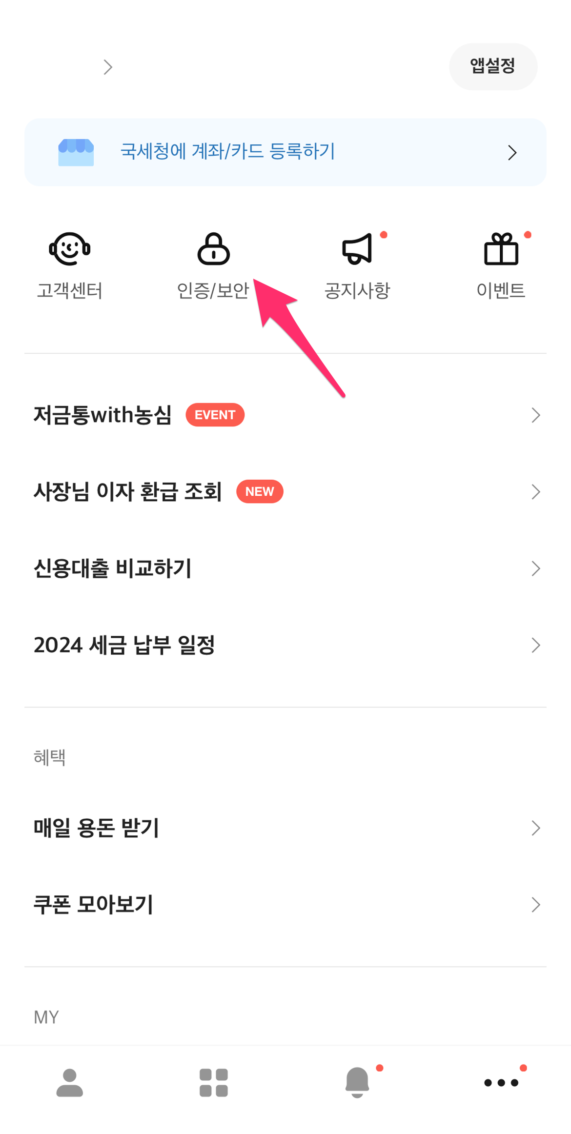 카카오뱅크 앱에서 오른쪽 하단 더 보기 메뉴를 선택한 후에 인증/보안을 선택합니다.