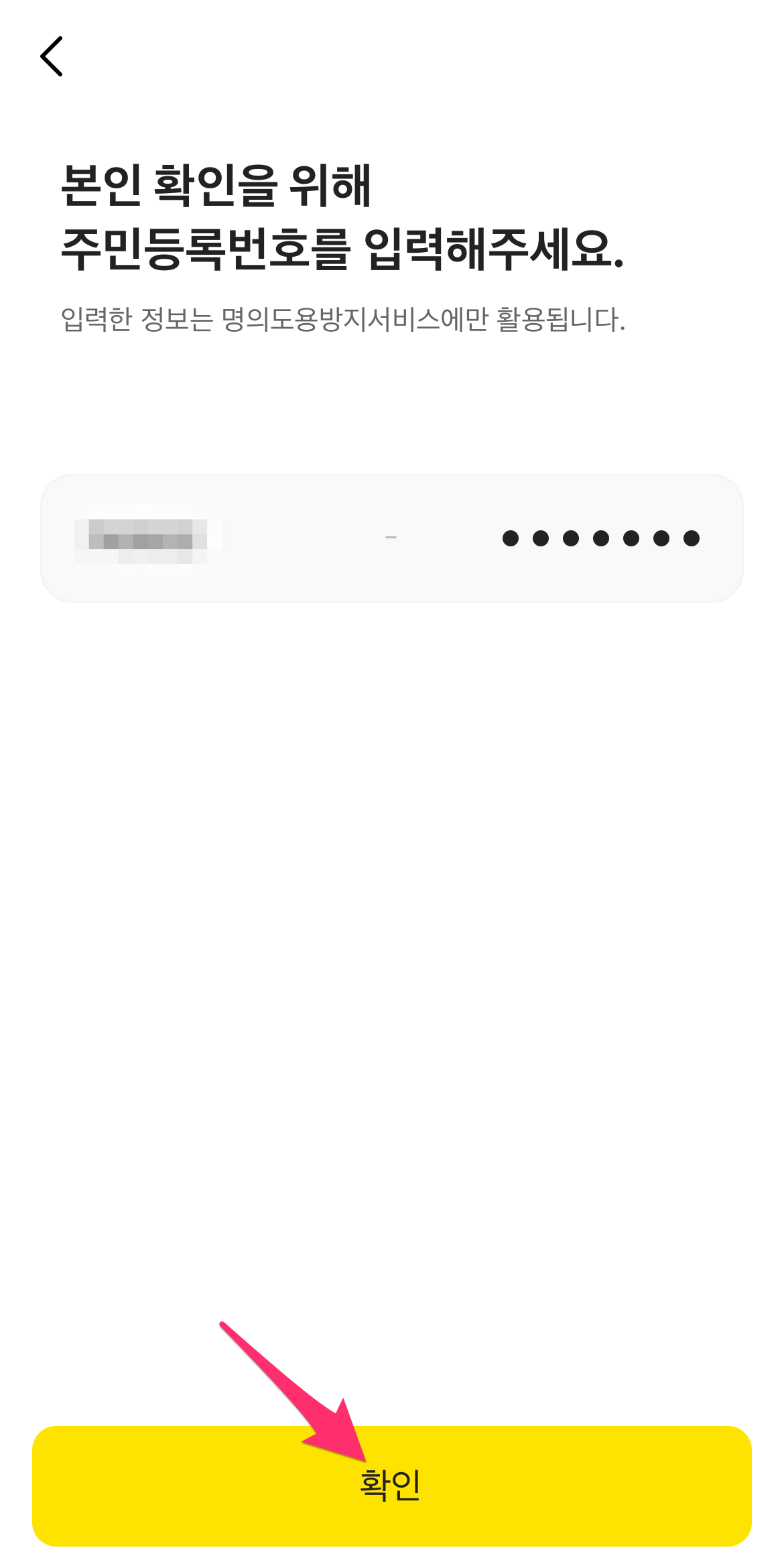 본인 확인을 위해 주민등록번호를 누른 후에 확인 버튼을 선택합니다.