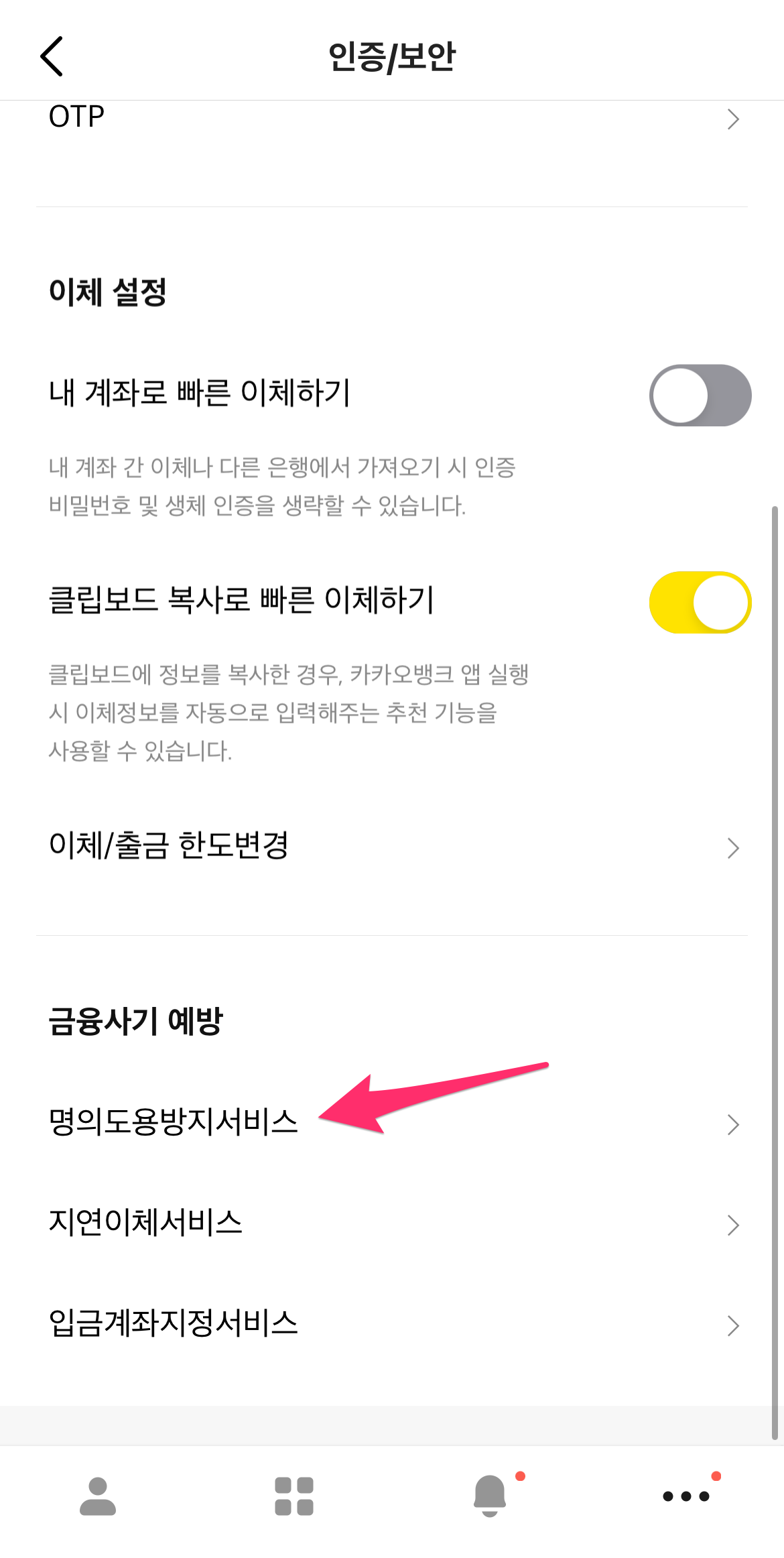 카카오뱅크 앱에서 오른쪽 하단 더 보기 메뉴를 선택한 후에 인증/보안을 선택합니다.