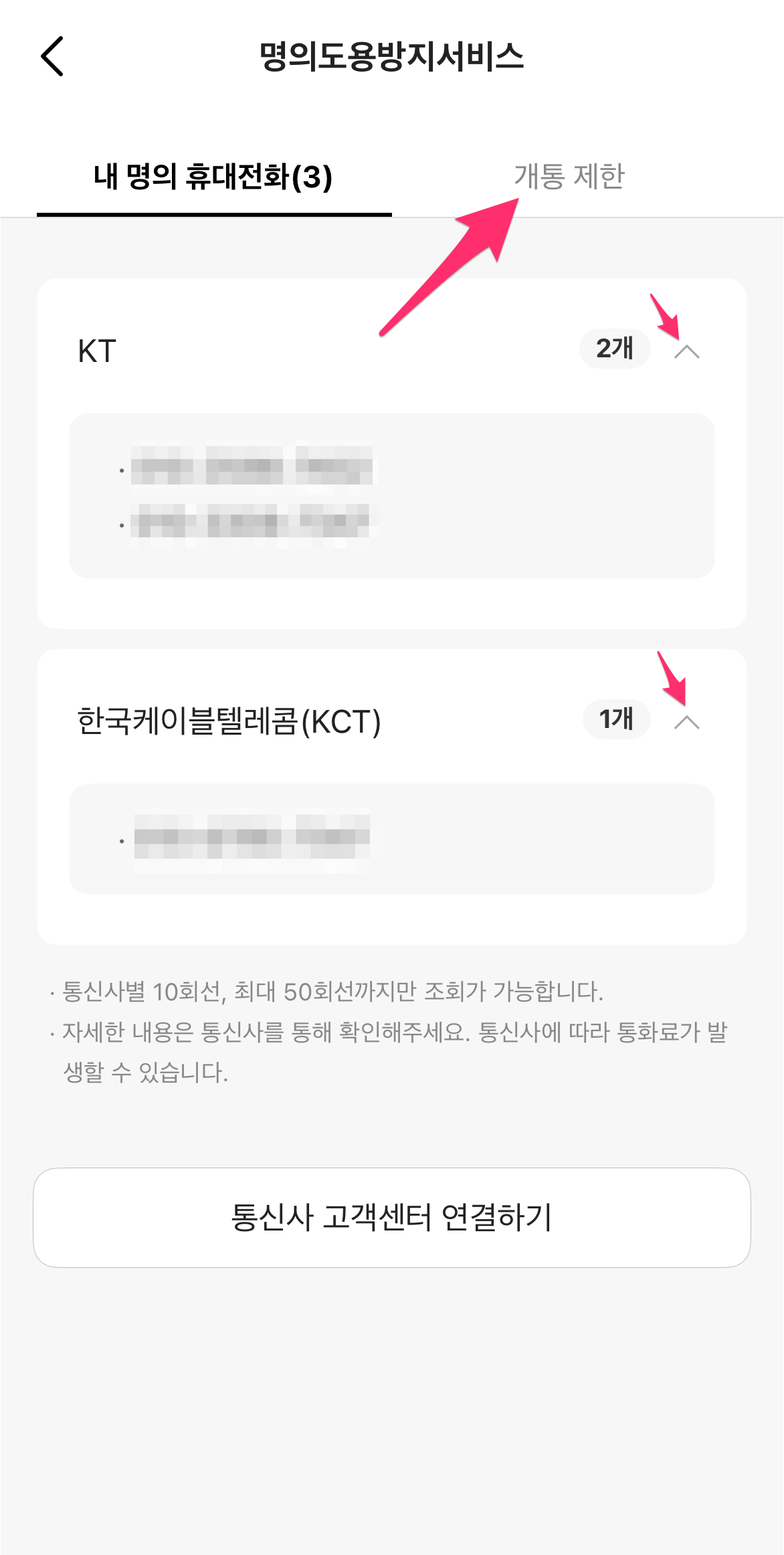 내 명의 휴대전화 목록에서 본인의 명의로 된 휴대전화를 확인합니다. 이제 상단 개통 제한을 선택합니다.