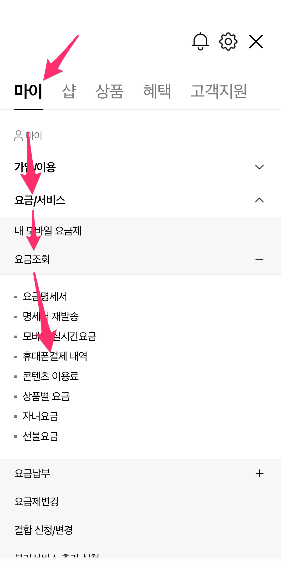 메뉴 [마이] → [요금/서비스] → [요금조회] → [휴대폰결제 내역]으로 들어갑니다.