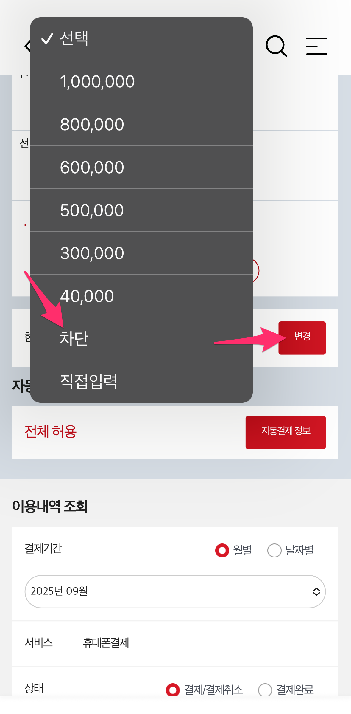한도변경을 선택한 다음에 차단을 선택하고 변경 버튼을 선택합니다.