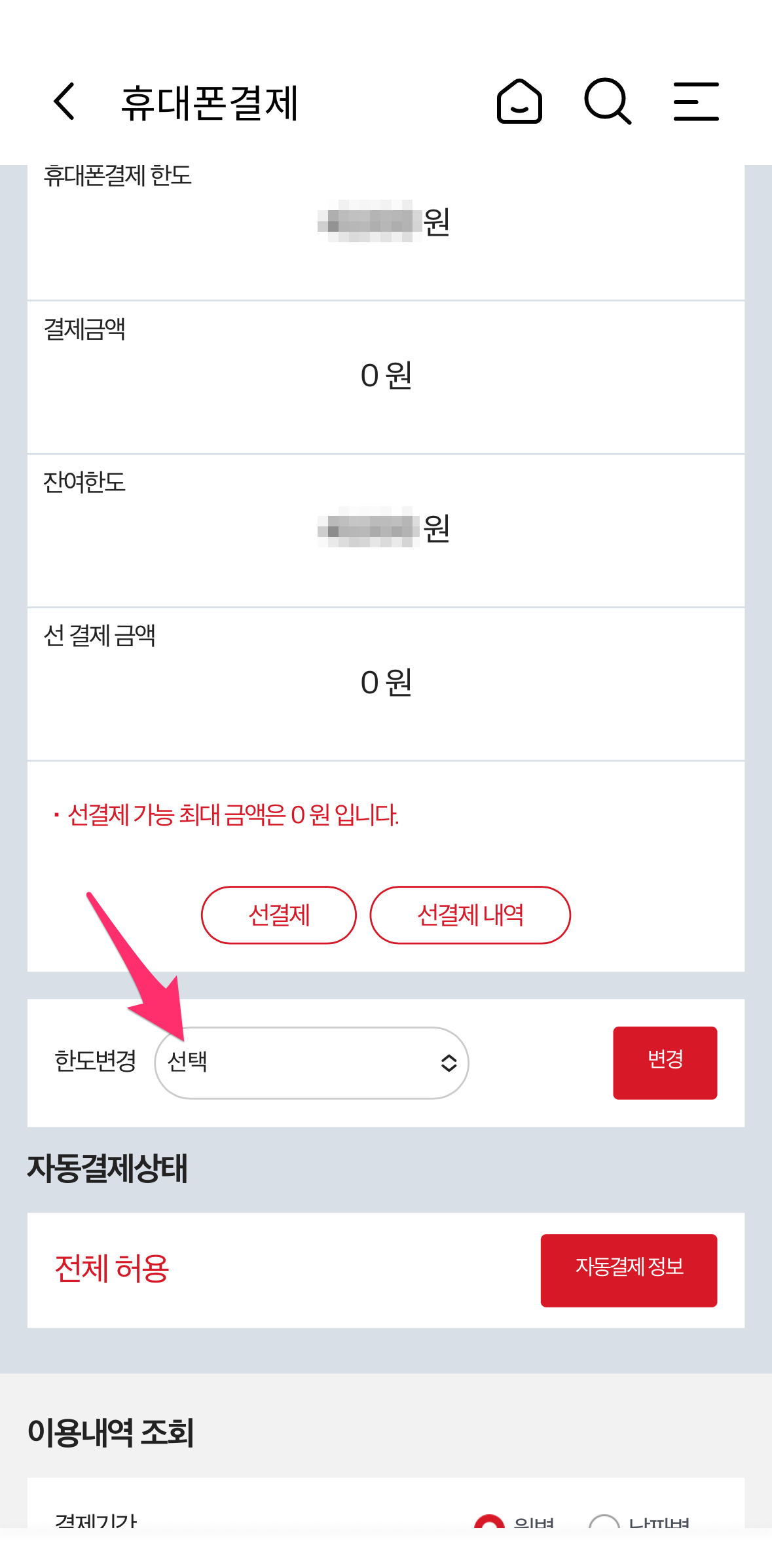 이용한도 상세 내역 및 한도 변경을 선택합니다.