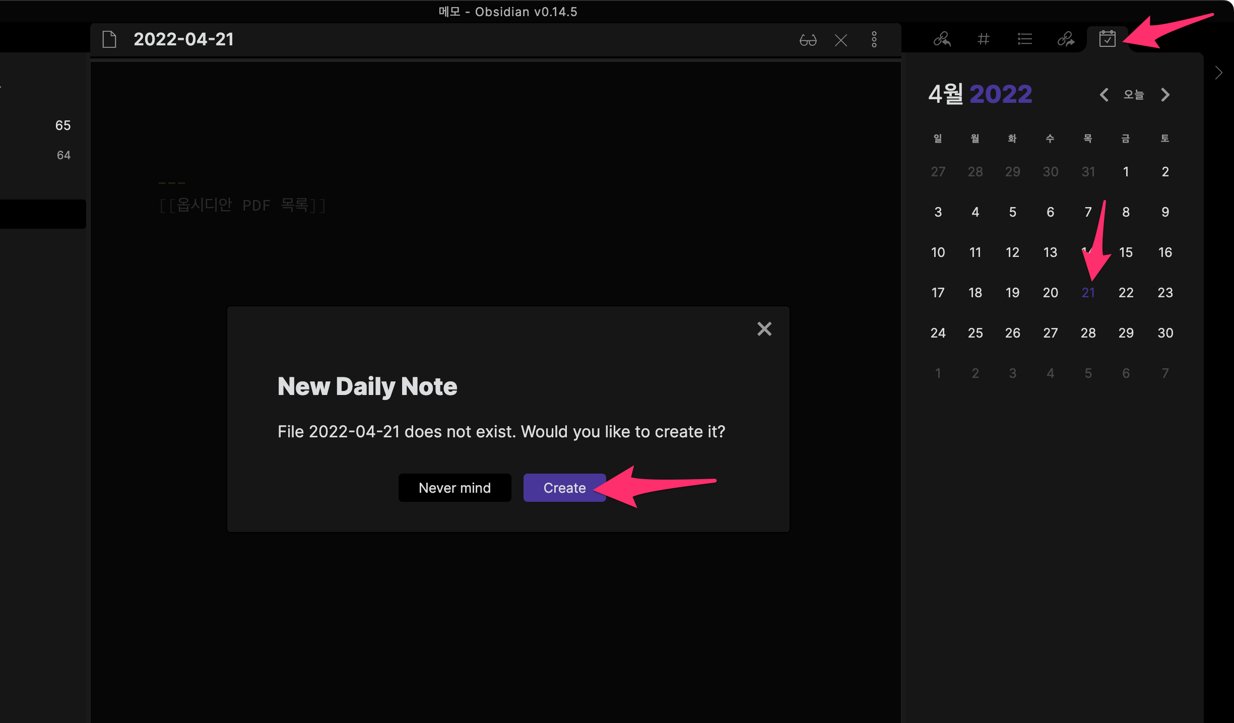 원하는 날짜를 선택하면 New Daily Note 창이 나오면서 Create 버튼을 선택하면서 노트가 생성됩니다.