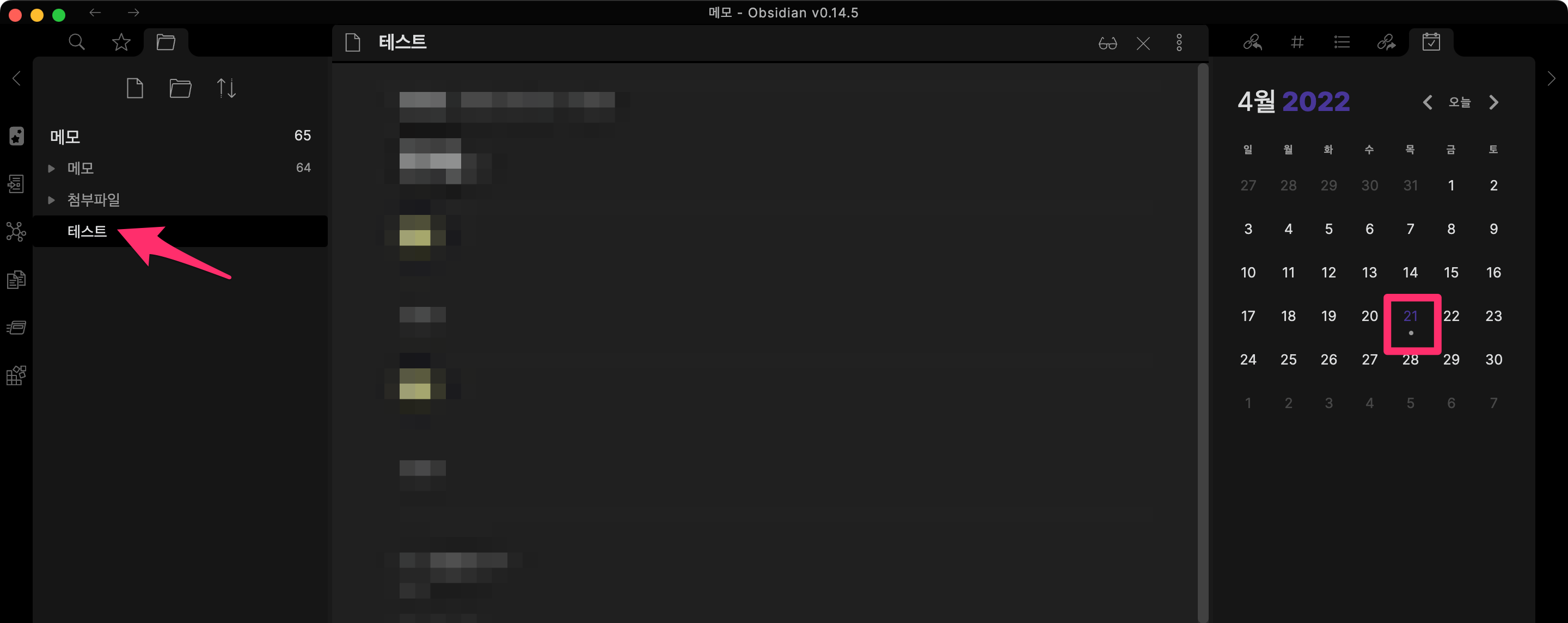 이렇게 하면 달력에서 원하는 날짜에 생성된 노트가 있는지 확인할 수 있기에 한눈에 확인할 수 있기에 저도 애용하는 플러그인입니다.