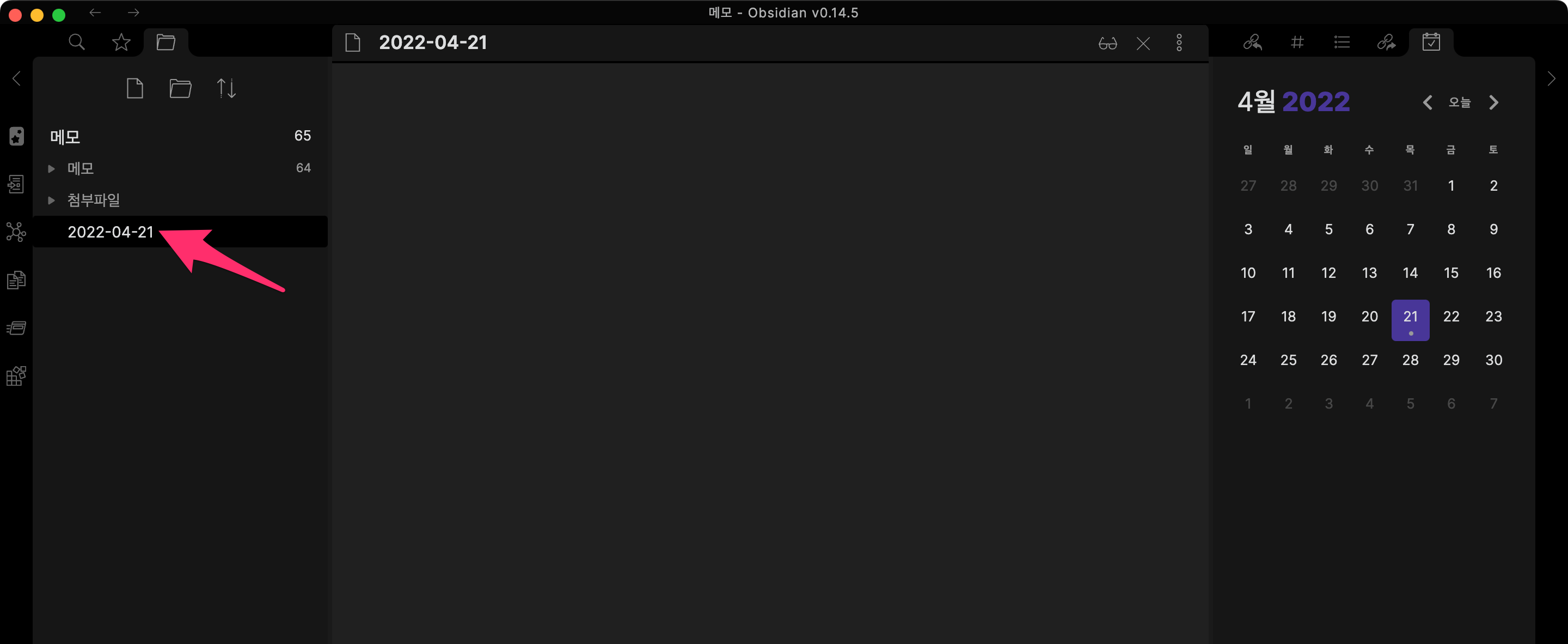 옵시디언 화면 오른쪽 상단에 보면 달력 아이콘이 생성되어 있습니다.