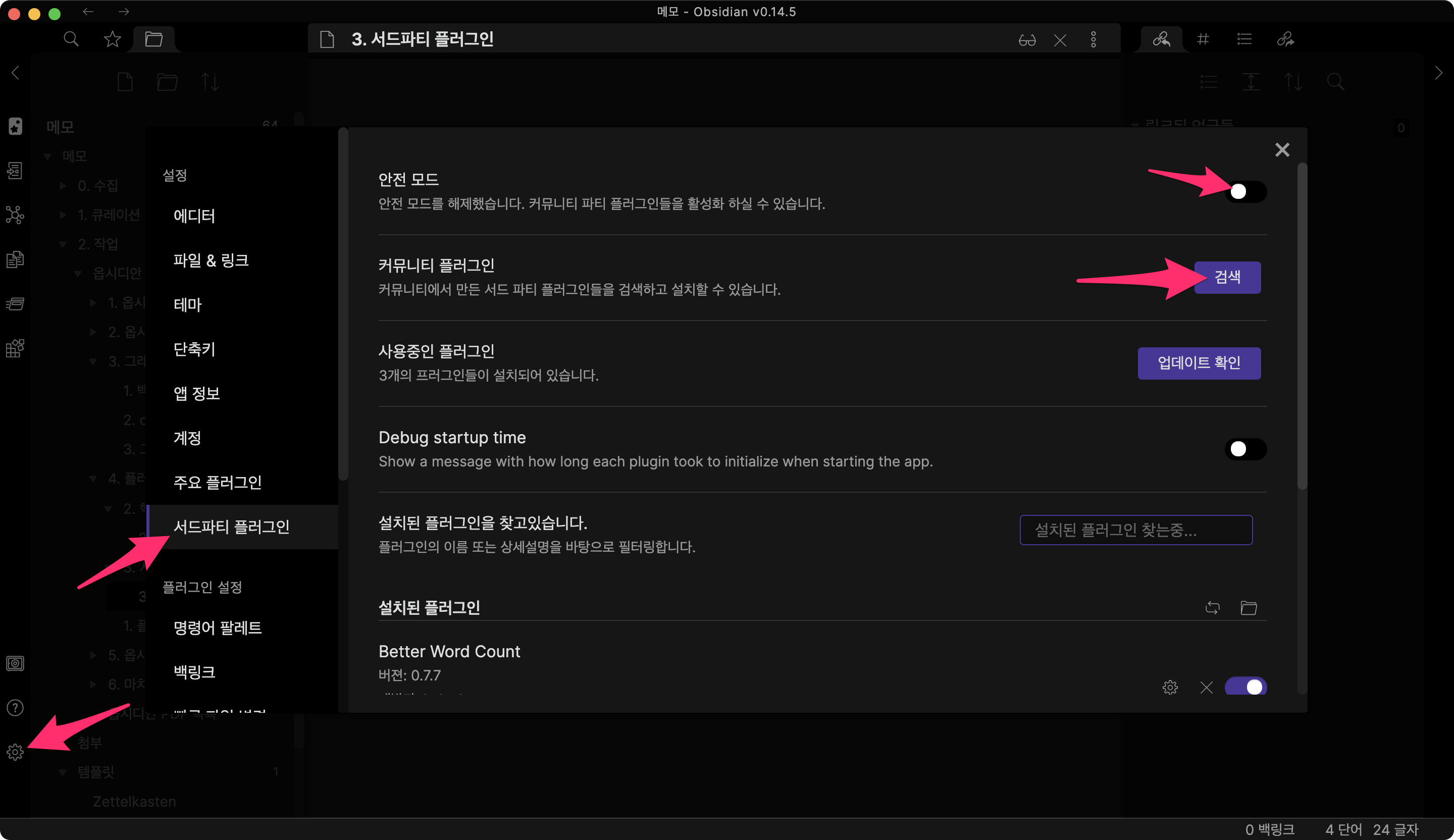 옵시디언 화면에서 왼쪽 하단 설정(톱니바퀴)을 선택하고 서드파티 플러그인을 선택하면 다양한 옵션을 확인할 수 있습니다.