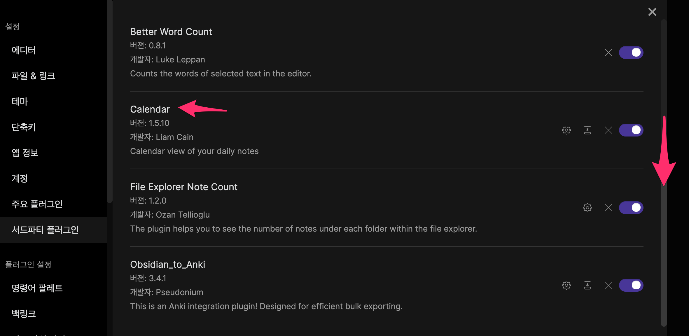 자... 이제 Calendar 서드파티 플러그인이 설치된 후에 다시 설정에서 서드파티 플러그인을 선택한 후에 밑으로 스크롤 해보면 Calendar 플러그인을 확인할 수 있습니다.