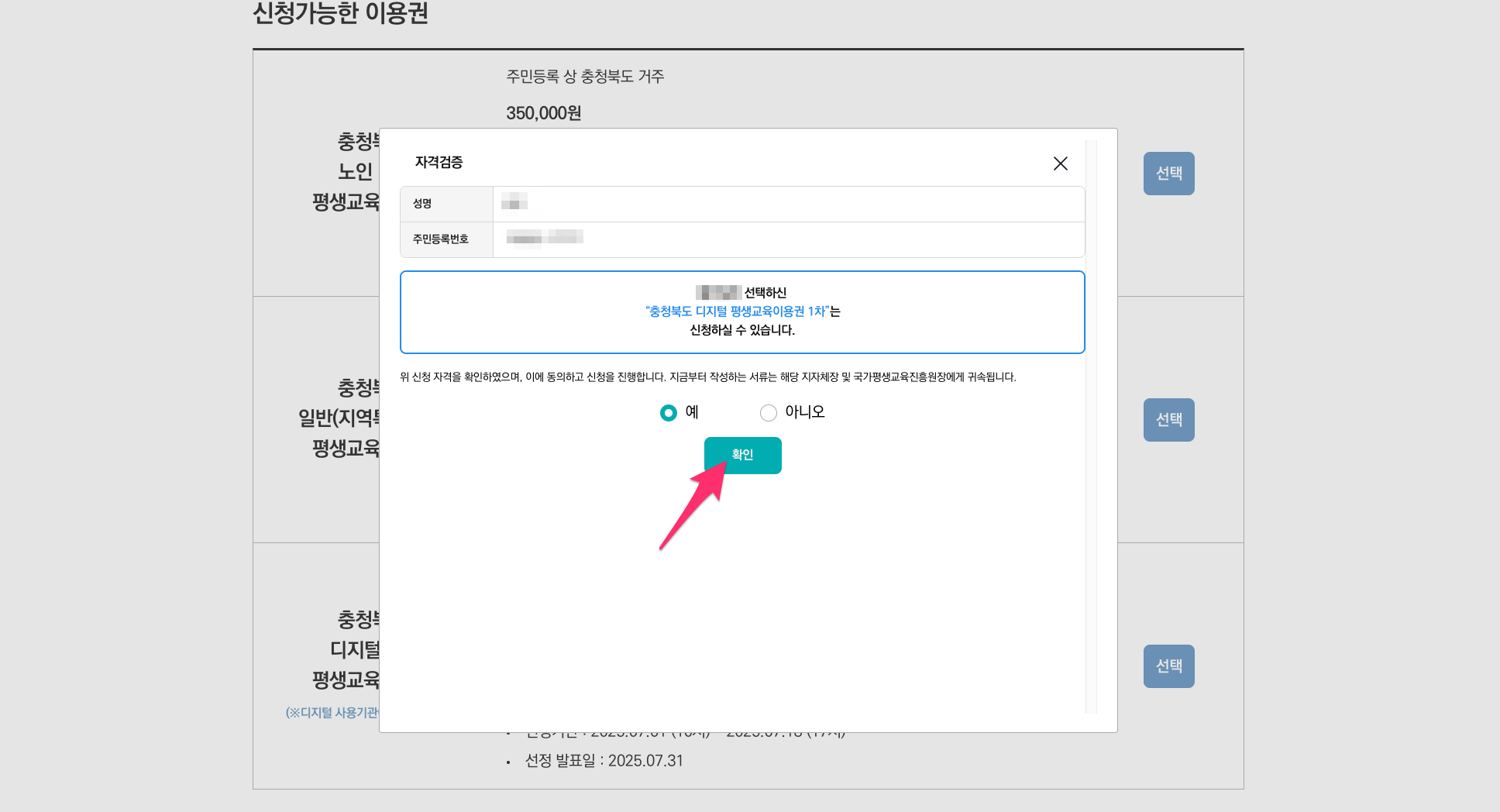자격검증이 완료되면 확인 버튼을 누르시면 됩니다.