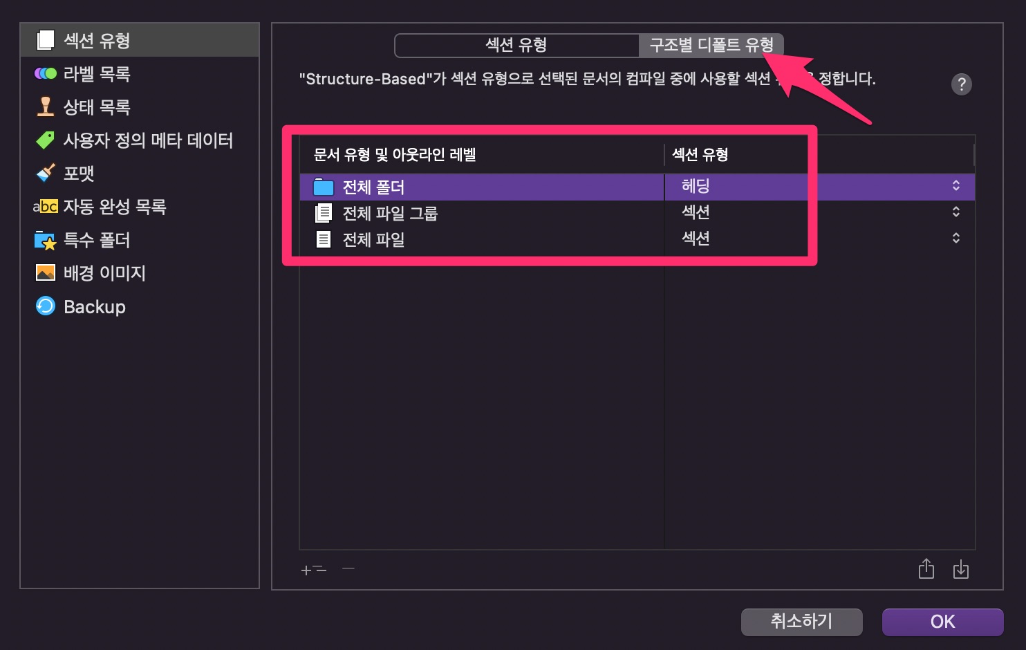 구조별 디폴트 유형을 선택하면 바이더에 있는 파일에 섹션을 정할 수 있습니다.