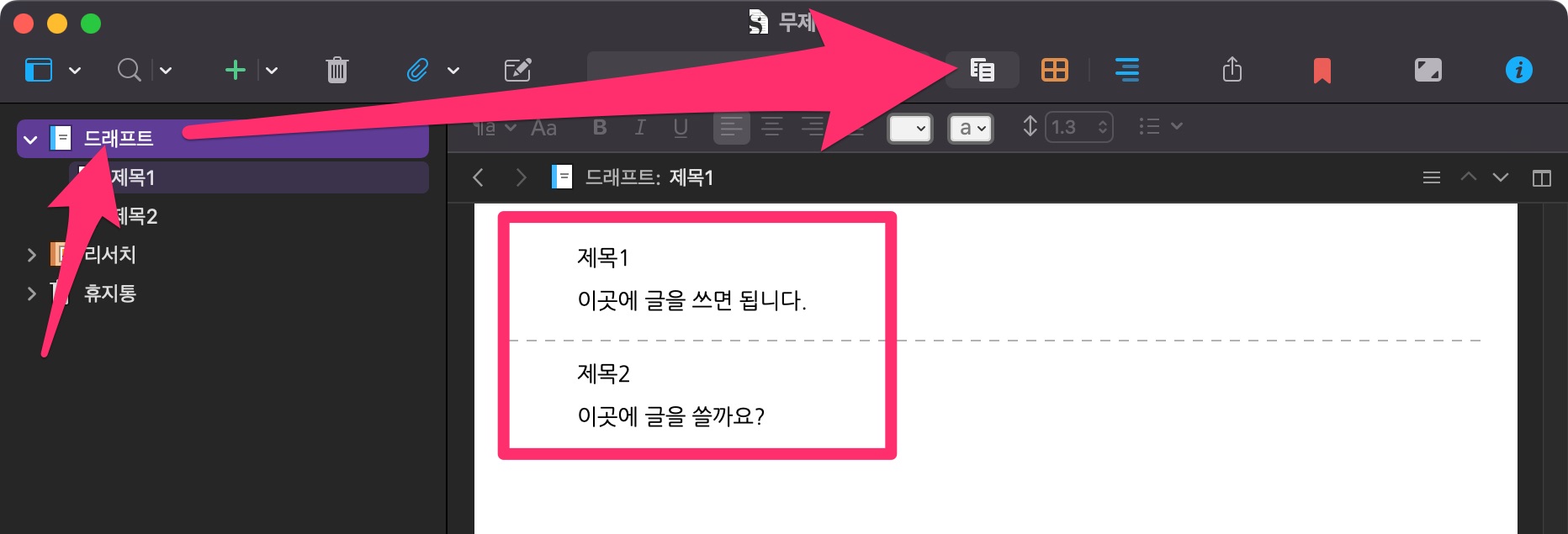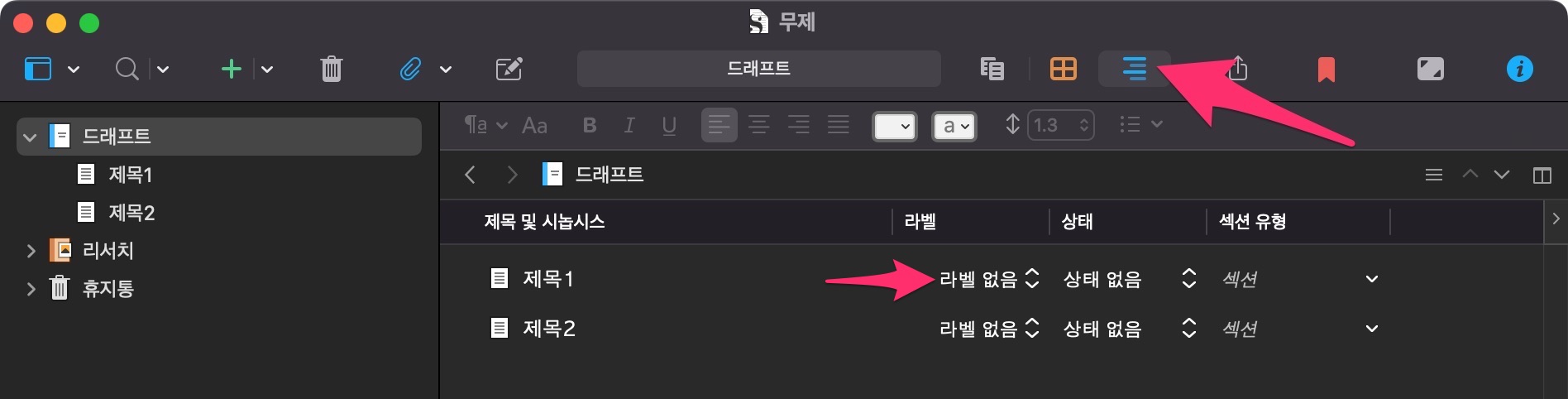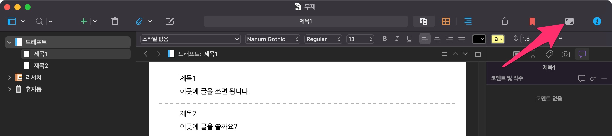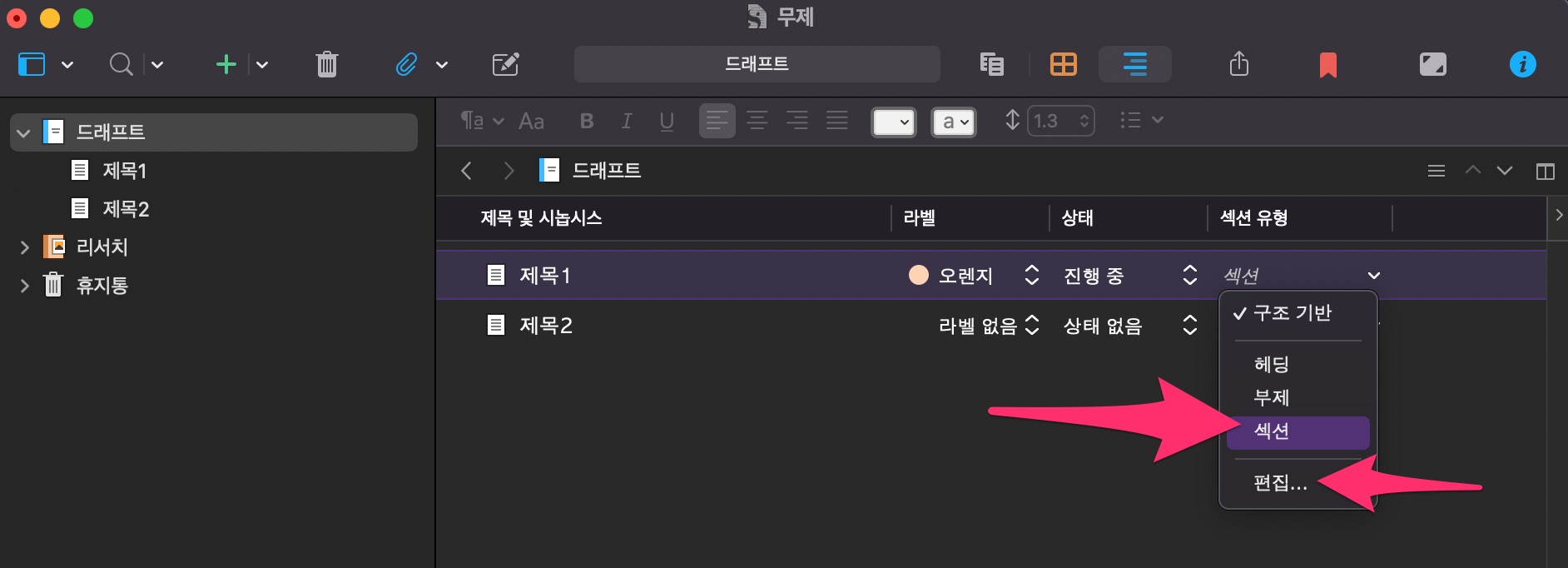 이런 모양은 스크리브너의 장점으로 드래프트의 문서 위치를 변경만 해도 전체 문서 순서가 간단하게 변경됩니다.