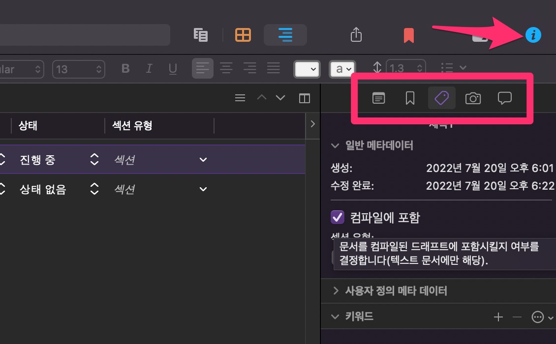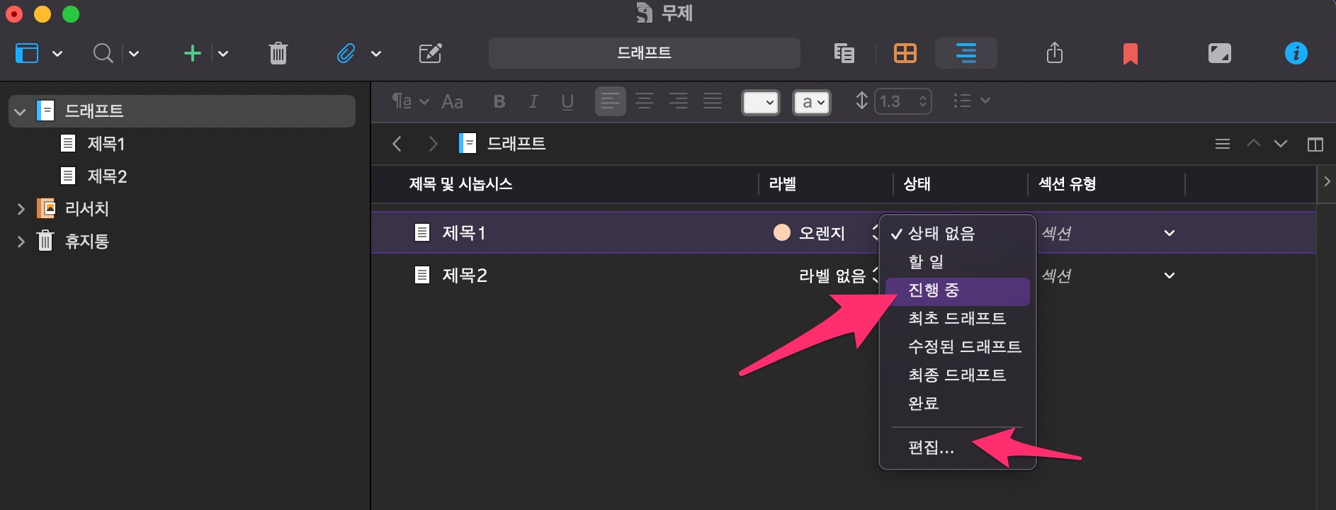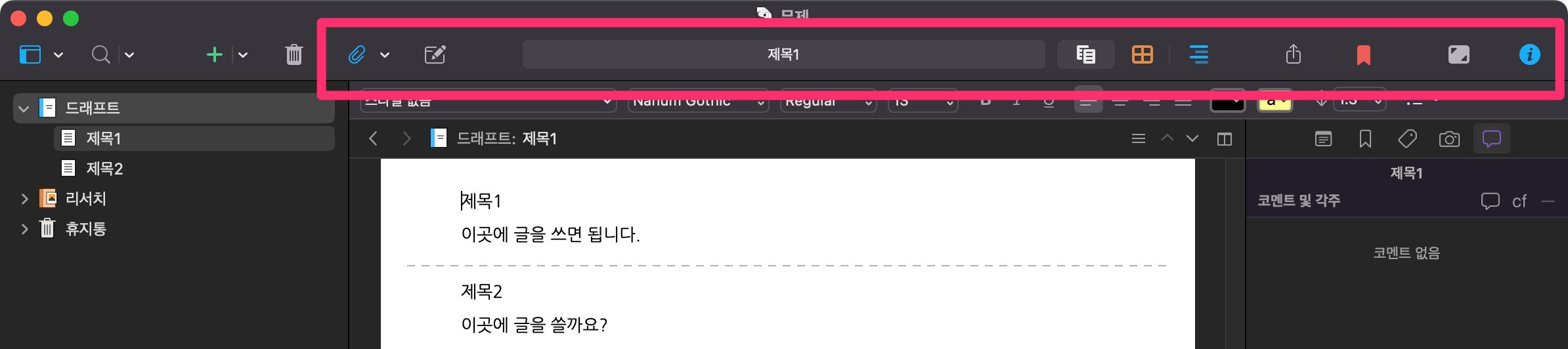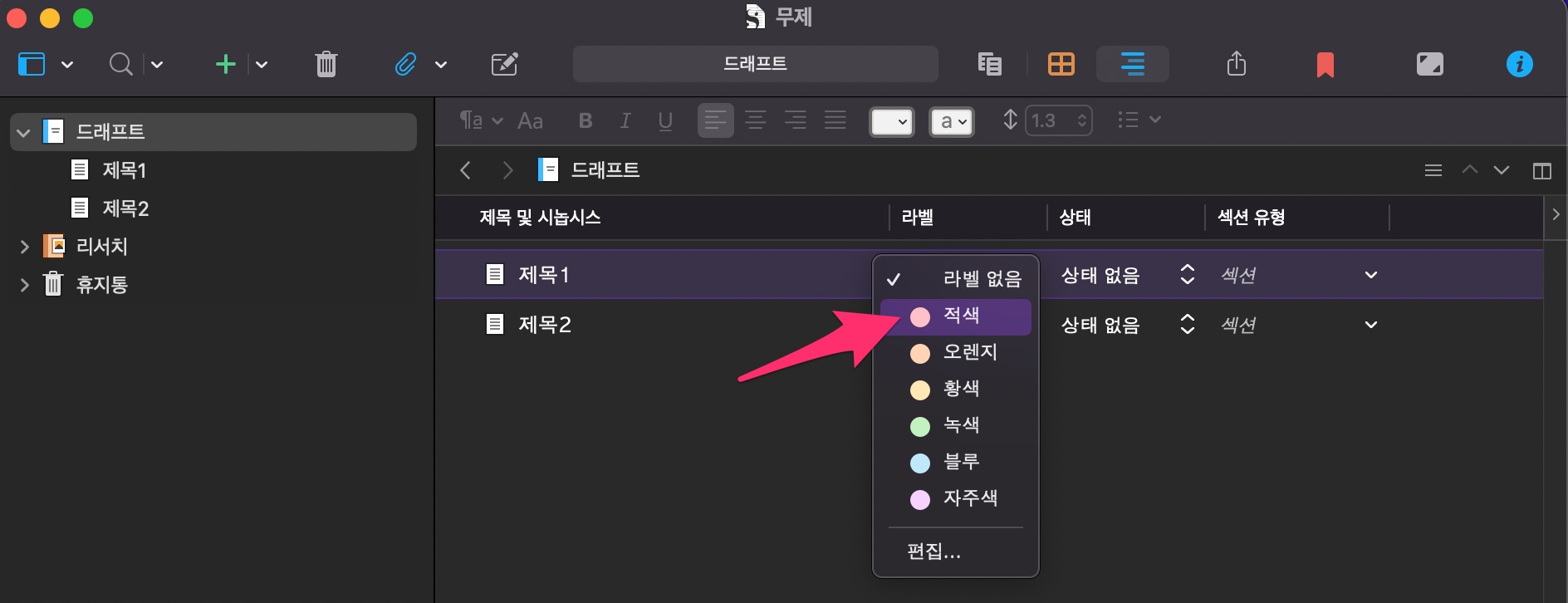이런 모양은 스크리브너의 장점으로 드래프트의 문서 위치를 변경만 해도 전체 문서 순서가 간단하게 변경됩니다.