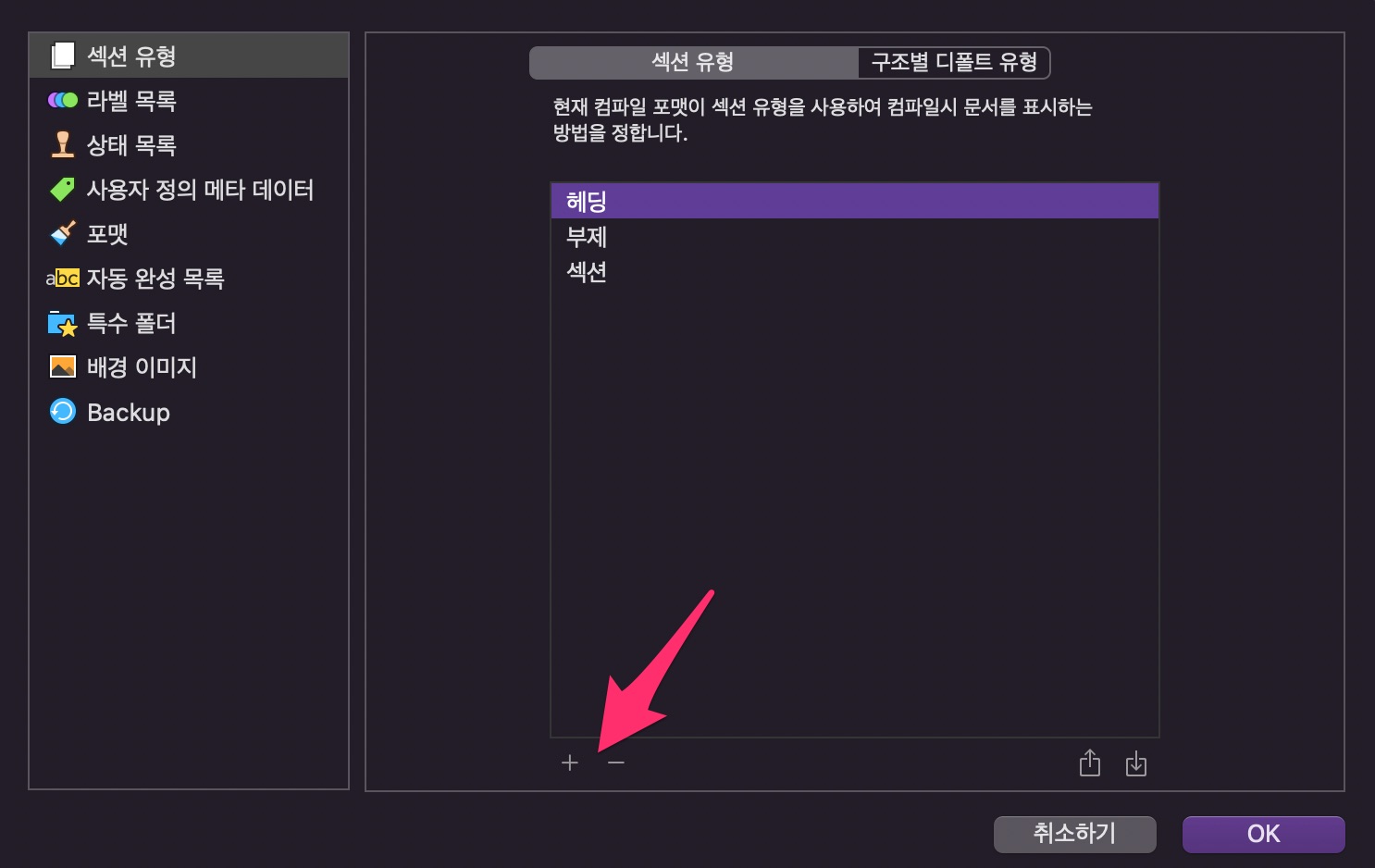 섹션 유형 목록도 하단에 +, - 버튼을 이용해서 삭제하고 추가하시면 됩니다.