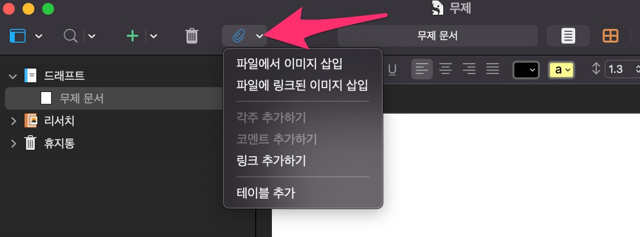 상단에 클립 아이콘을 선택하면 이미지 삽입, 각주, 코멘트, 링크 및 테이블을 추가합니다.