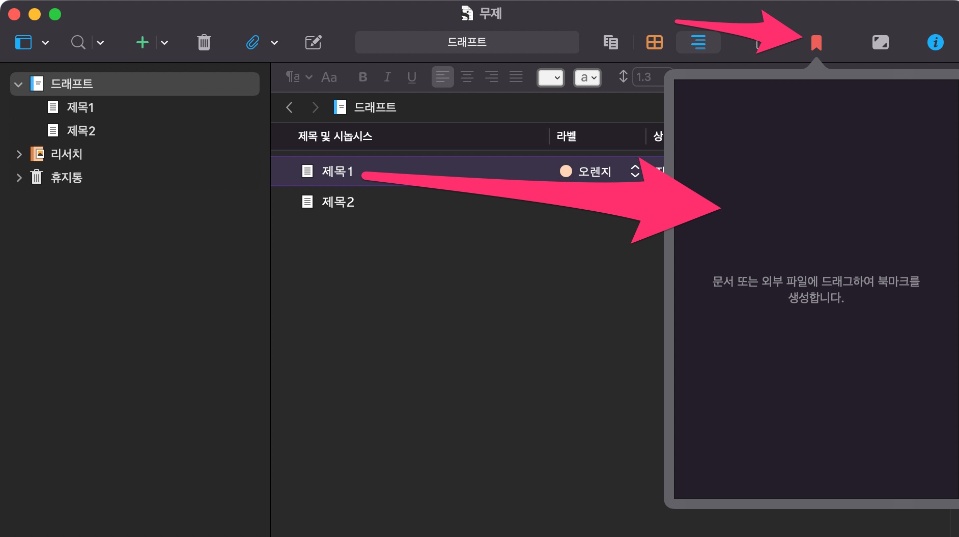 북마크 버튼을 선택하고 문서나 외부 파일을 드래그하면 북마크가 생성됩니다.
