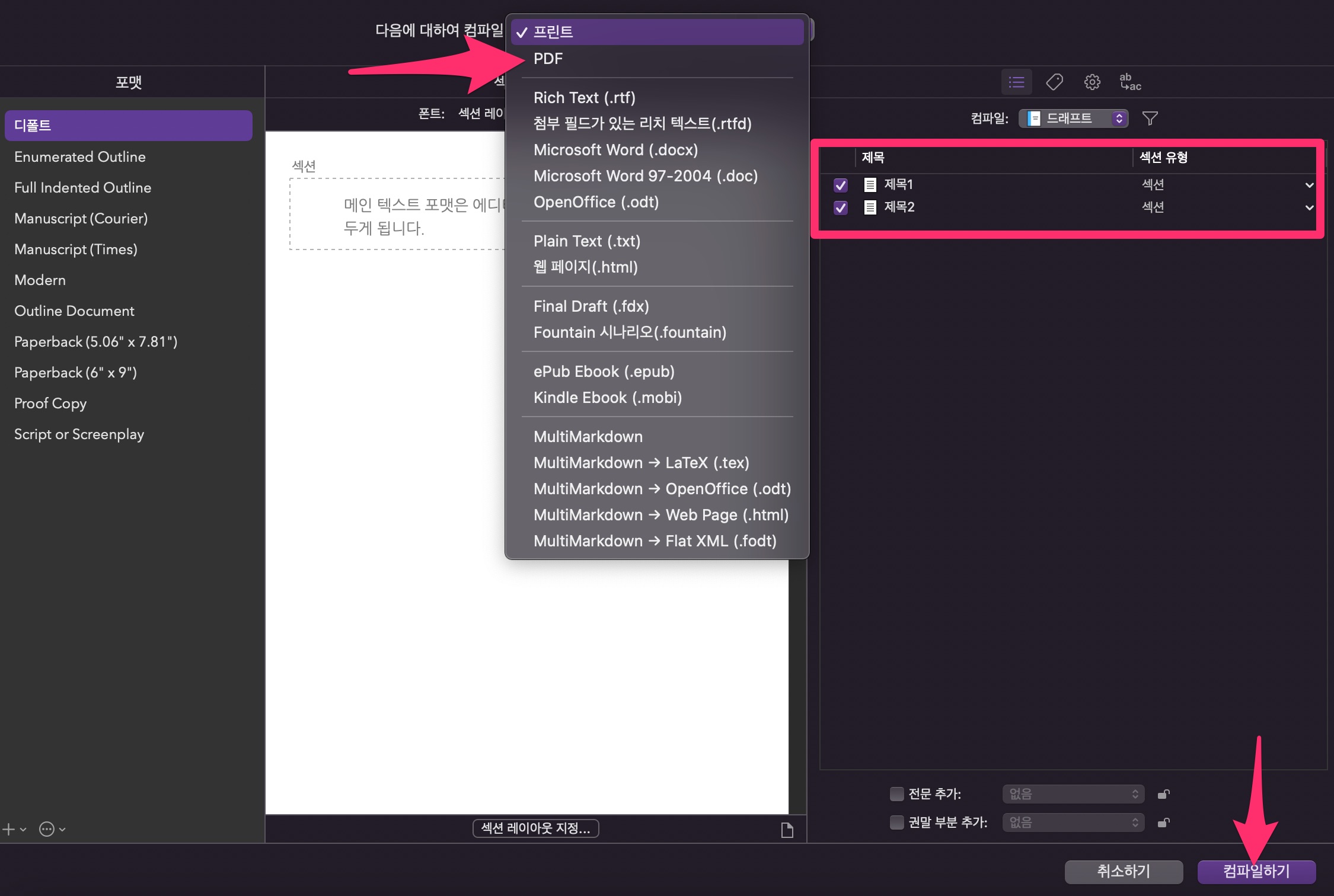 상단에 다음에 대하여 컴파일에서 PDF로 선택하고 왼쪽에 컴파일 목록을 확인하면 됩니다.