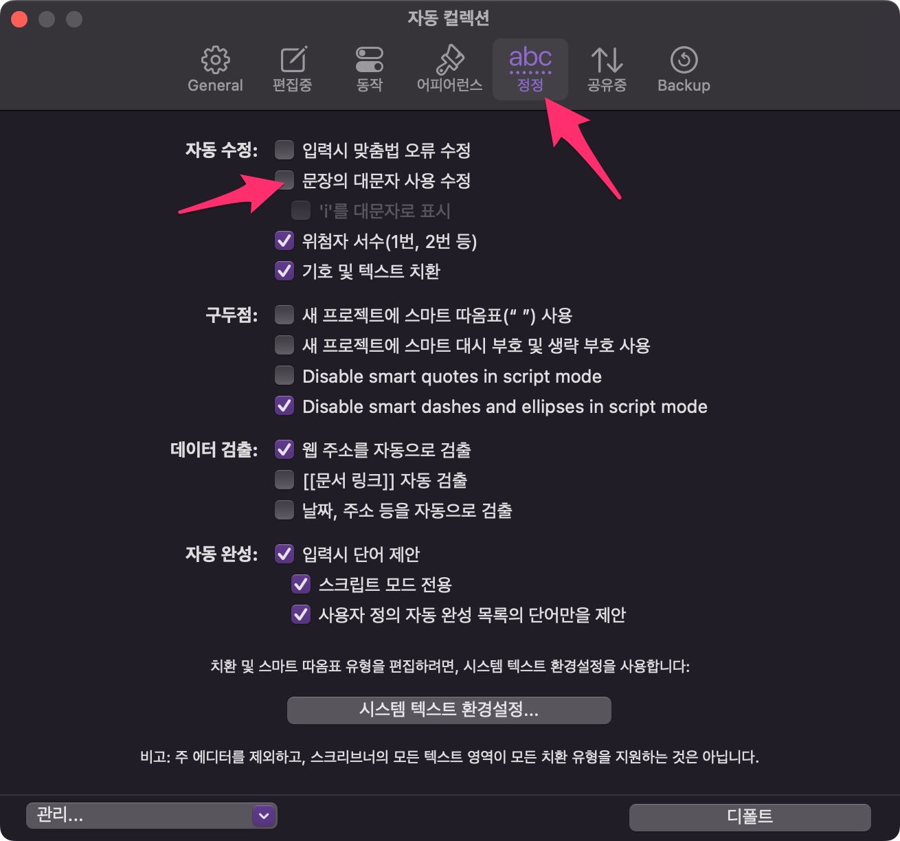 정정에서는 다른 것보다 문장의 대문자 사용 수정 체크 해제합니다.