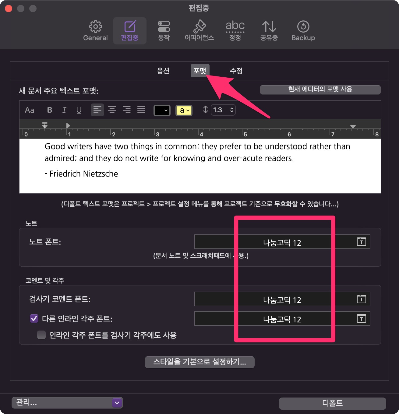 혹시나 편집하는 폰트가 작게 느껴지면 디폴트 텍스트 확대를 올리시면 화면에서 크게 보입니다.