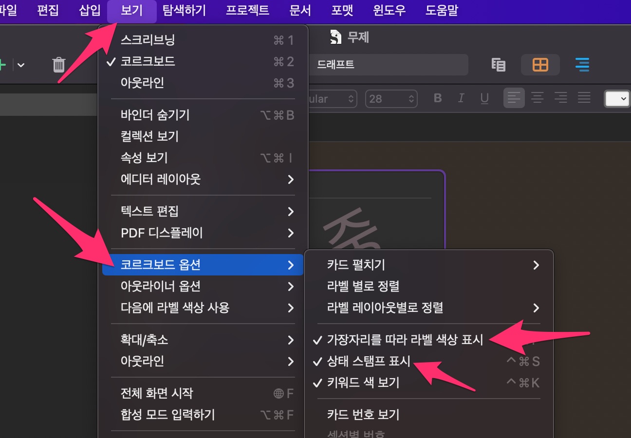 메뉴 [보기] - [코르크보드 옵션]에서 [가장자리를 따라 라벨 색상 표시], [상태 스탬프 표시]를 선택합니다.