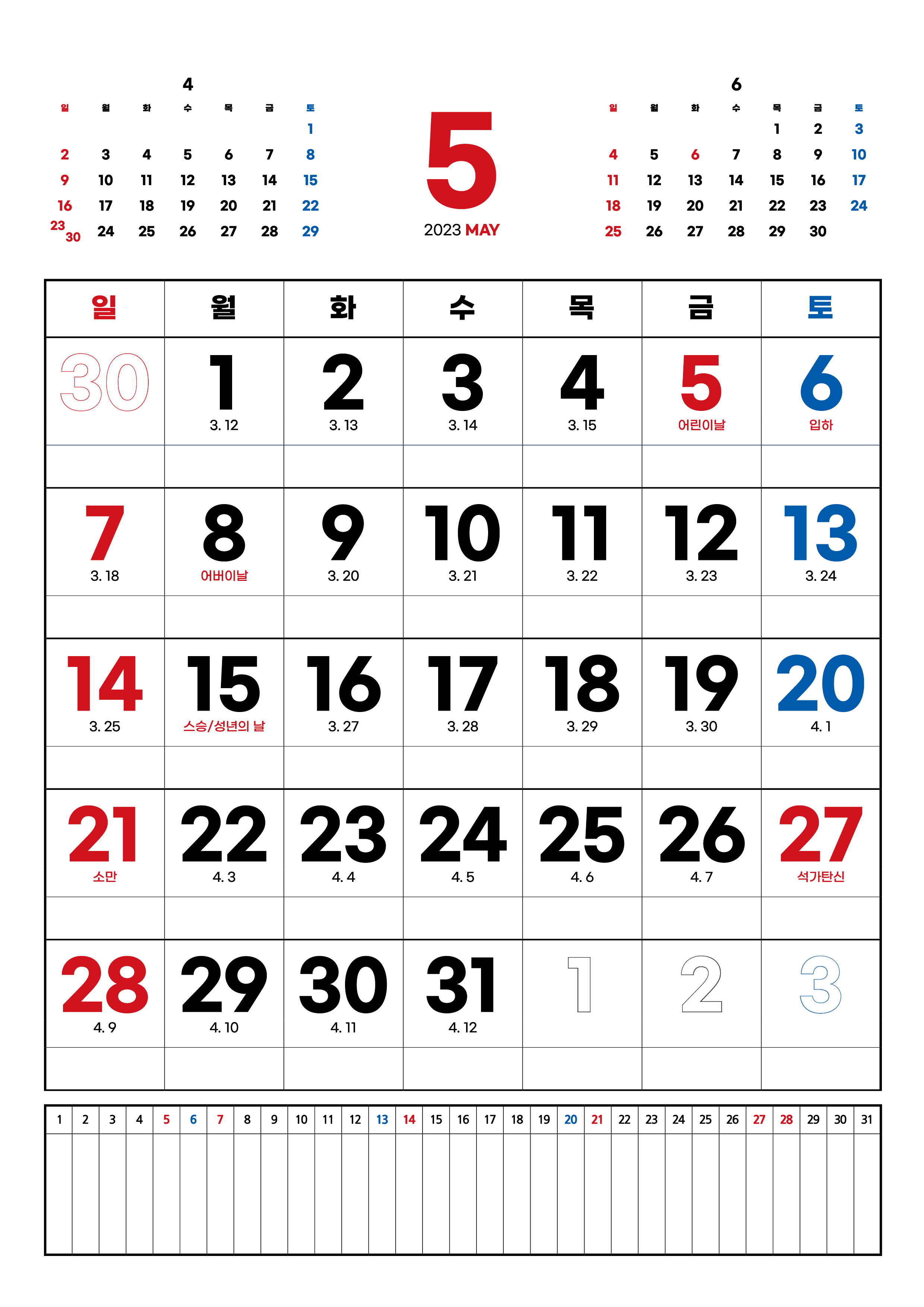 LIFE 5월 달력 by 구반장 2023. 3. 31. 반응형 5월 달력입니다. 글 하단에 있는 pdf를 다운로드하세요. 월간구반장_5월.pdf 0.15MB 반응형 공유하기 게시글 관리 구반장의 잡다한 지식 저작자표시 비영리 변경금지 (새창열림) 'LIFE' 카테고리의 다른 글 7월 달력 (0) 2023.05.31 6월 달력 (0) 2023.04.30 4월 달력 (0) 2023.02.28 3월 달력 (0) 2023.01.31 달력 (0) 2023.01.09 관련글 7월 달력 6월 달력 4월 달력 3월 달력 댓글