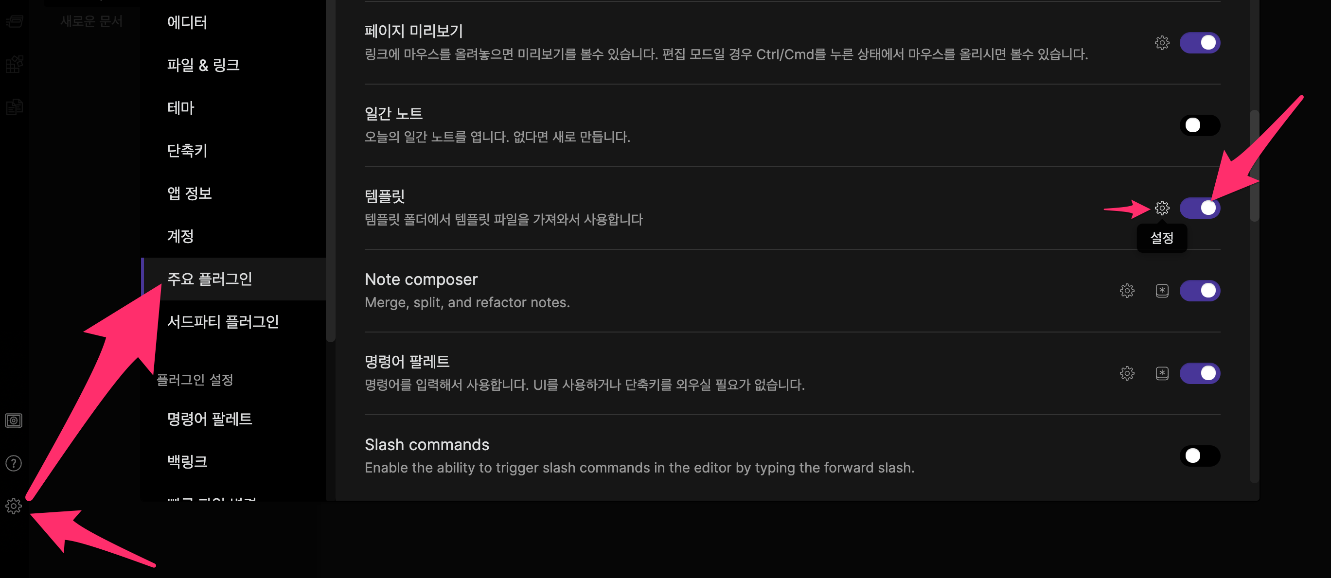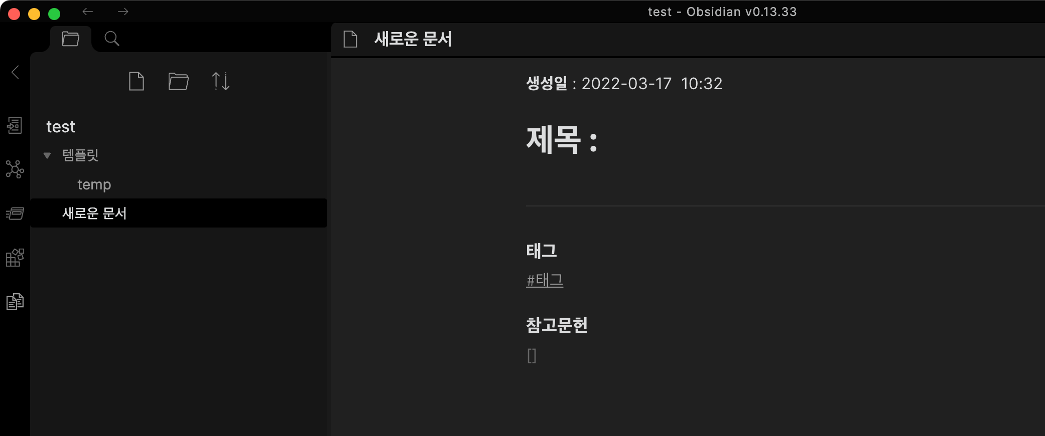 옵시디안에서는 이러한 초반 작성 루틴을 미리 만들어서 새 문서를 만들면 미리 작성한 템플릿(작성 날짜, 제목 스타일, 하단 첨부 사항 등)을 삽입할 수 있습니다.