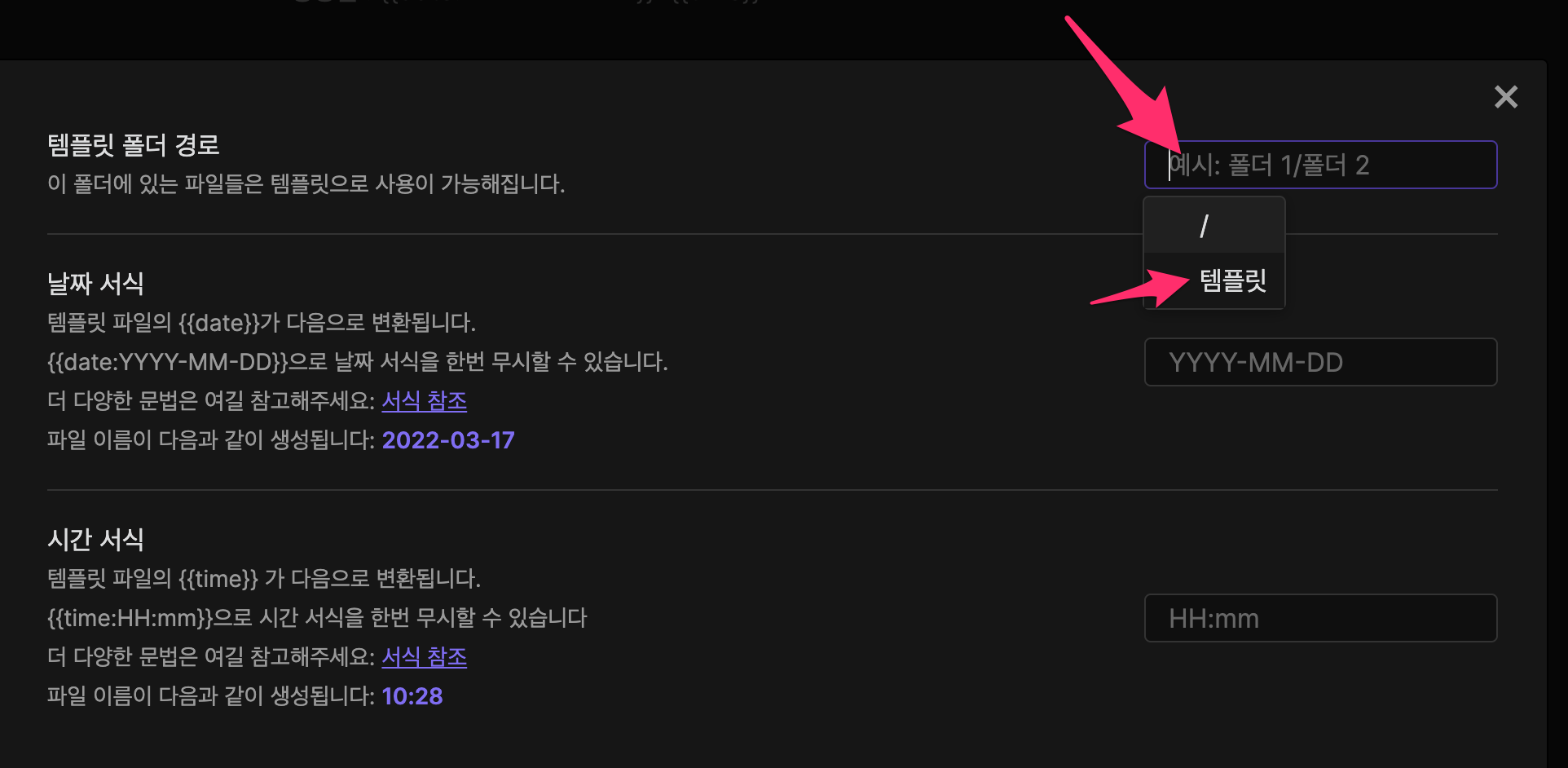 참고로 상단에 생성일을 보시면 {{date:YYYY-MM-DD}}를 연도, 월, 일 형식의 날짜가 나오고 {{time:HH:mm}} 부분은 {{time}} 변경해도 시:분 형식으로 나옵니다.